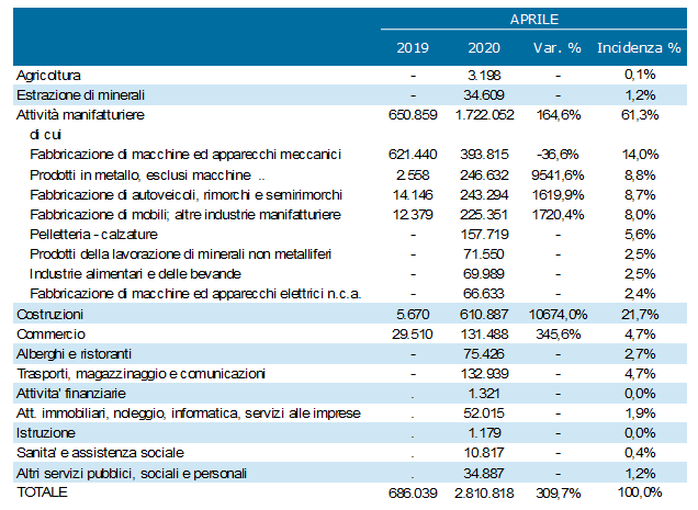 Rispetto al 2019, i settori in cui il livello di intervento è aumentato in maniera più importante sono il comparto delle costruzioni (+10674%), il commercio (+345,6%) e il manifatturiero (+164,6%). Nei servizi l’aumento è di rilievo anche se non calcolabile in termini percentuali in quanto nel 2019 non c’era stato alcun intervento di sostegno (0 ore autorizzate).