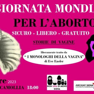 Ed a partire dai nostri corpi e con le nostre parole vi aspettiamo il 28 Settembre ore 18 all’Area Verde Camollia per la nostra iniziativa “STORIE DI VAGINE” libero adattamento da “I monologhi della vagina” di Eve Ensler. NonUnaDiMenoSiena – Movimento Pansessuale Arcigay Siena – Ciclo Maggio – Link Siena