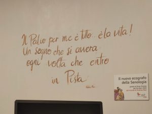 Sulla parete della stanza che ospita l’ecografo, con il tufo, l’artista Claudia Nerozzi ha scritto una frase che Brio diceva spesso: “Il Palio per me è tutto, è la vita. Un sogno che si avvera ogni volta che entro in pista”.