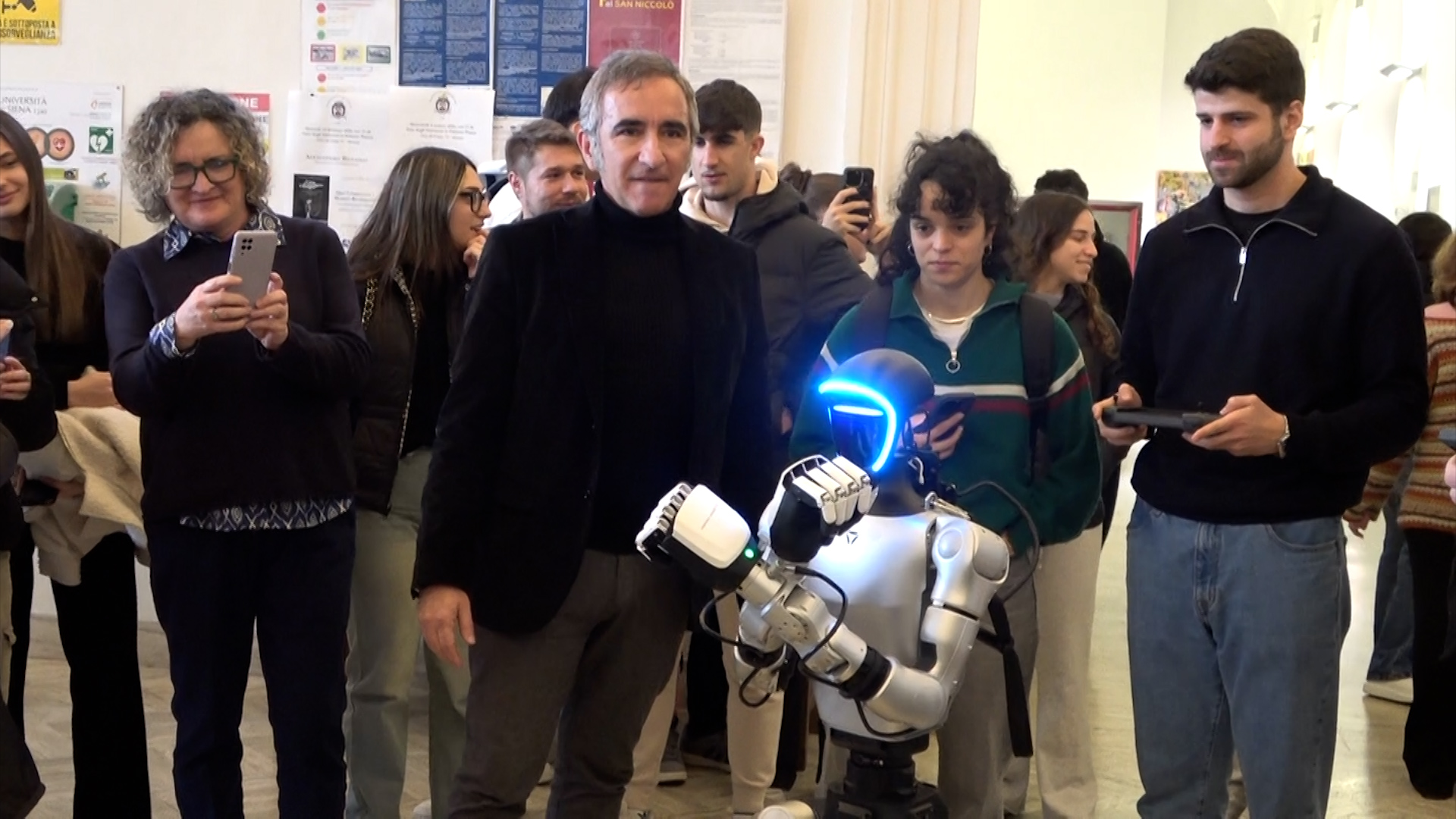 “Questo è uno degli ultimi robot della Unitrix – spiega il professore di Robotica Domenico Prattichizzo -, acquistato grazie a un progetto PNRR. Utilizziamo linguaggi di intelligenza artificiale simili a quelli di ChatGPT, ma applicati al movimento e ai comandi sensori-motori. Lo facciamo muovere in tutti i modi possibili. Lavoriamo sulla Human-Robot Interaction: colleghiamo le persone ai robot umanoidi con braccialetti e sensori, per aiutare chi ha disabilità nella vita quotidiana o nel lavoro. Non vogliamo sostituire l’uomo, ma potenziarne le capacità grazie alla tecnologia”.