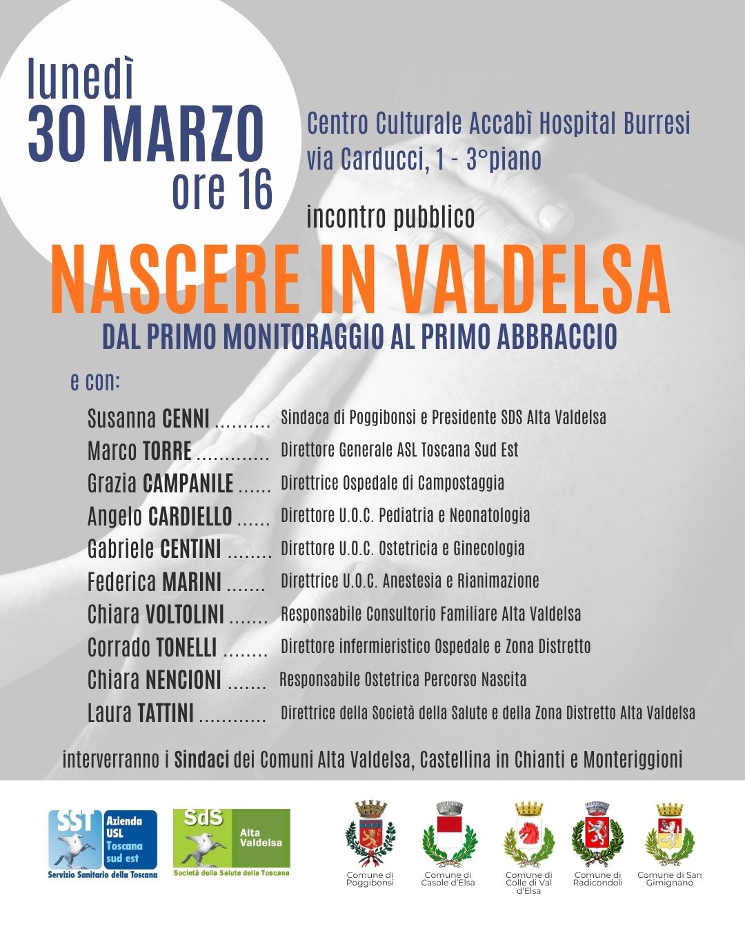 L’iniziativa è voluta e promossa congiuntamente dai Comuni dell’Alta Valdelsa (Casole d’Elsa, Colle di Val d’Elsa, Poggibonsi, San Gimignano, Radicondoli), di Monteriggioni e di Castellina in Chianti, dalla Asl Toscana Sud Est e dalla Società della Salute Alta Valdelsa. All’incontro saranno presenti i professionisti della sanità coinvolti nel percorso nascita, protagonisti del presidio ospedaliero, del consultorio, della sanità territoriale.