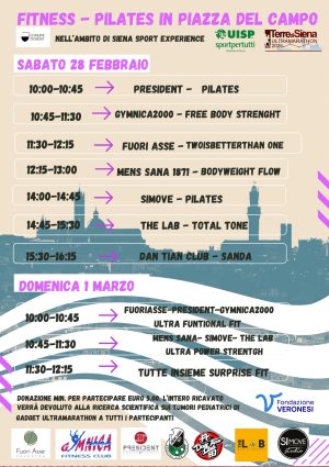 Tornano Palestre Insieme con “Fitness – Pilates in Piazza del Campo”, l’evento organizzato da UISP Siena e promosso in collaborazione con il comune di Siena all’interno di Siena Sport Experience, unisce molte palestre di Siena per due giorni di movimento e benessere in Piazza del Campo. Sabato 28 febbraio dalle 10.00 alle 16.15 e domenica 1 marzo dalle 10.00 alle 12.15, orario in cui inizieranno gli arrivi dei concorrenti alle gare, pilates e fitness con Palestra Fuori Asse, Gymnica Fitness Club, Mens Sana, President Health and Fitness, Dan Tian Club, The Lab – Work in Progress e SiMove Studio.
