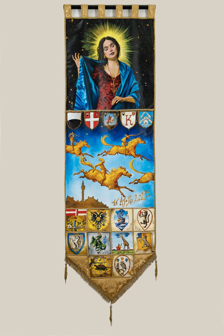 Nel suggestivo scenario del Cortile del Podestà è stato svelato il Drappellone del Palio di Siena del 16 agosto 2025, opera del pittore siciliano Francesco De Grandi. La presentazione è stata affidata alla critica d’arte Helga Marsala, che ha illustrato al pubblico i dettagli e il significato dell’opera.