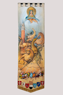 Al centro del drappo, il secondo capitolo di grande impatto visivo. Un gruppo di 10 cavalli, elemento stilistico di Di Jullo. Trasmettono forza e impeto. Caratteristiche richieste su un campo di battaglia, che sia Montaperti o l’anello di Piazza del Campo. Ma anche fluidità. L’altra cifra figurativa del pittore molisano. Destrieri e cavalli rappresentati in un momento di guerra dove domina un cromatismo che è un chiaro richiamo ai colori del tufo sul quale, due volte l’anno, i senesi combattono la loro personalissima “guerra” di amore e passione. In mezzo a questo tumulto di muscoli, zoccoli e teste, un altro frammento importante della storia di questo artista che ha visto realizzare il desiderio di dipingere il Palio. Un racconto affidato nuovamente alla simbologia con lo stemma di Pescocostanzo, città in cui lavora, quello di Siena, di cui si è innamorato, della sua regione nativa ed infine della Regione Toscana.