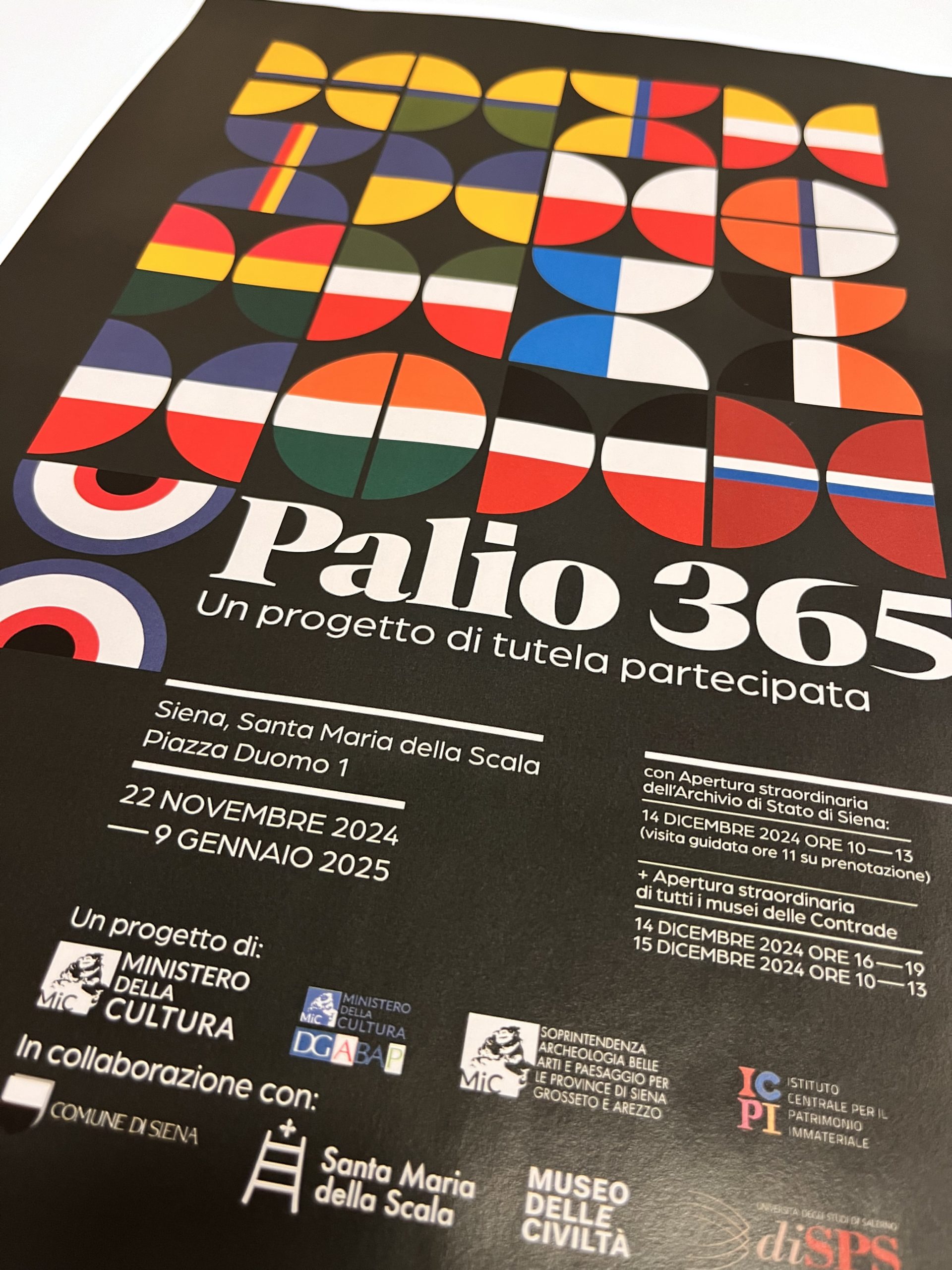 Promossa dalla Soprintendenza Archeologia Belle Arti e Paesaggio per le province di Siena, Grosseto e Arezzo insieme all’Istituto Centrale per il Patrimonio Immateriale del Ministero della Cultura, in collaborazione con numerose istituzioni locali, la mostra illustra i risultati di un importante lavoro di ricerca volto alla tutela e salvaguardia del patrimonio immateriale del Palio di Siena. Tra i partner coinvolti figurano il Comune di Siena, l’Università degli Studi di Siena, l’Università per Stranieri di Siena, l’Archivio di Stato di Siena, il Museo delle Civiltà, il Magistrato delle Contrade e i Priori delle 17 Contrade.