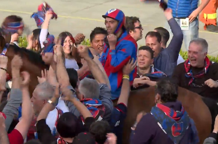Samo aveva avuto in sorte il cavallo El Rey e come fantino, la scelta era caduta su Gavino Sanna. Già dalle prime battute Samo era considerata una delle favorite. In finale otto contrade, di seguito l’ordine ai canapi agli ordini del mossiere Andrea Calamassi: Torre con Antonio Siri e Premiere Da Clodia, Botteghe con Valter Pusceddu e Exuberant, Samo con Gavino Sanna e El Rey, Ferruzza con Sebastiano Murtas e Enalotto Super, Borgonovo con Carlo Sanna e Bramoso de Campeda, S.Andrea con Andrea Sanna e Diamante Sauro, S. Pierino con Dino Pes e Cecco Biondo, di rincorsa Massarella con Antonio Mula e Bonvayage. Buono fin da subito l’allineamento tra i canapi, il mossiere abbassa un paio di volte il canape per evitare che i cavalli fianchino in anticipo sui tempi di mossa. Poi si parte con un buon allineamento. Samo e Borgonovo prendono velocemente il controllo della corsa, fino a quando c’è una rimonta strepitosa da dietro di S. Pierino con un Dino Pes determinato che arriva secondo sul palo, lasciando in terza posizione Borgonovo con Carlo Sanna. Gavino Sanna si conferma ancora una volta il re di Fucecchio, con il Palio di oggi, salgono a cinque le vittorie collezionate dal fantino delle regolari prestato alla provincia, nella Buca.