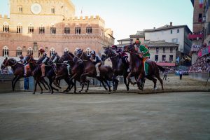 Nessuna novità per quanto riguarda le accoppiate che si sono formate ieri dopo l’assegnazione dei cavalli nella terza prova del Palio del 16 agosto, che si è corsa questo pomeriggio in un’affollata Piazza del Campo e che è stata vinta dalla contrada dell’Istrice, con Viso d’Angelo e Giovanni Atzeni detto Tittia. Una prova caratterizzata da un po’ di movimento tra i canapi, con un buon allineamento nella parte centrale e larghi spazi lasciati nella parte bassa, tant’è che il mossiere Bircolotti ha deciso di far uscire tutti due volte per allentare un po’ la tensione. Al terzo rientro finalmente si parte, Leocorno, Valdimontone e Istrice partono davanti a tutti, ma escono bene anche l’Oca, la Lupa e il Nicchio. Turbine fa scorrere forte Zentiles, prova a galoppo sostenuto la curva di San Martino e quella del Casato. Alle sue spalle la Lupa e il Nicchio. L’accoppiata di Pantaneto resta in testa per due giri, poi lascia il comando al Valdimontone prima e all’Istrice poi, che arriva forte da dietro e che va a vincere la terza prova.