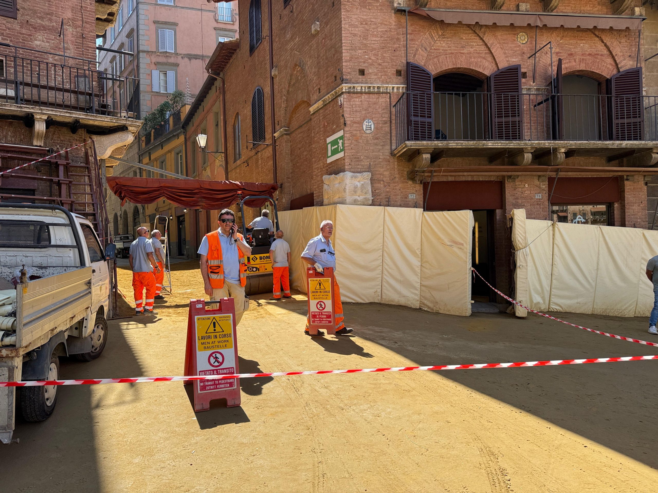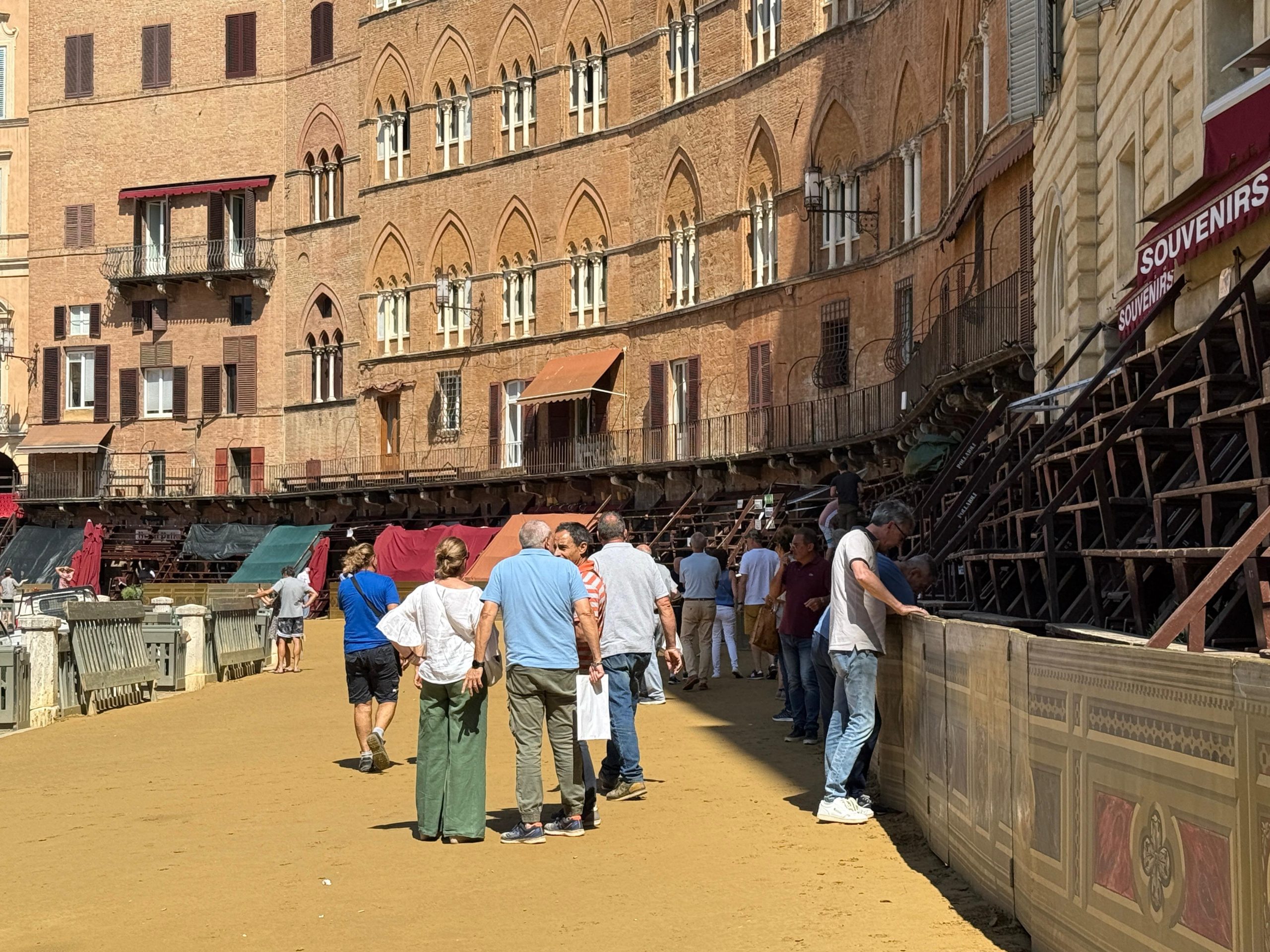Commissione vigilanza questa mattina in piazza del Campo per il controllo di palchi e tufo. Circa due ore di controlli che hanno portato ad esaminare tutti gli elementi in vista del via alla carriera del 2 luglio. Confermati tutte le procedure dello scorso anno, dagli steccati ai metodi di stesura del tufo. Il caldo previsto per questi giorni secondo i tecnici non creerà problemi al tufo, che verrà semplicemente annaffiato più spesso. Ottime le condizioni al momento della terra, in attesa delle prove di notte in programma domani mattina.