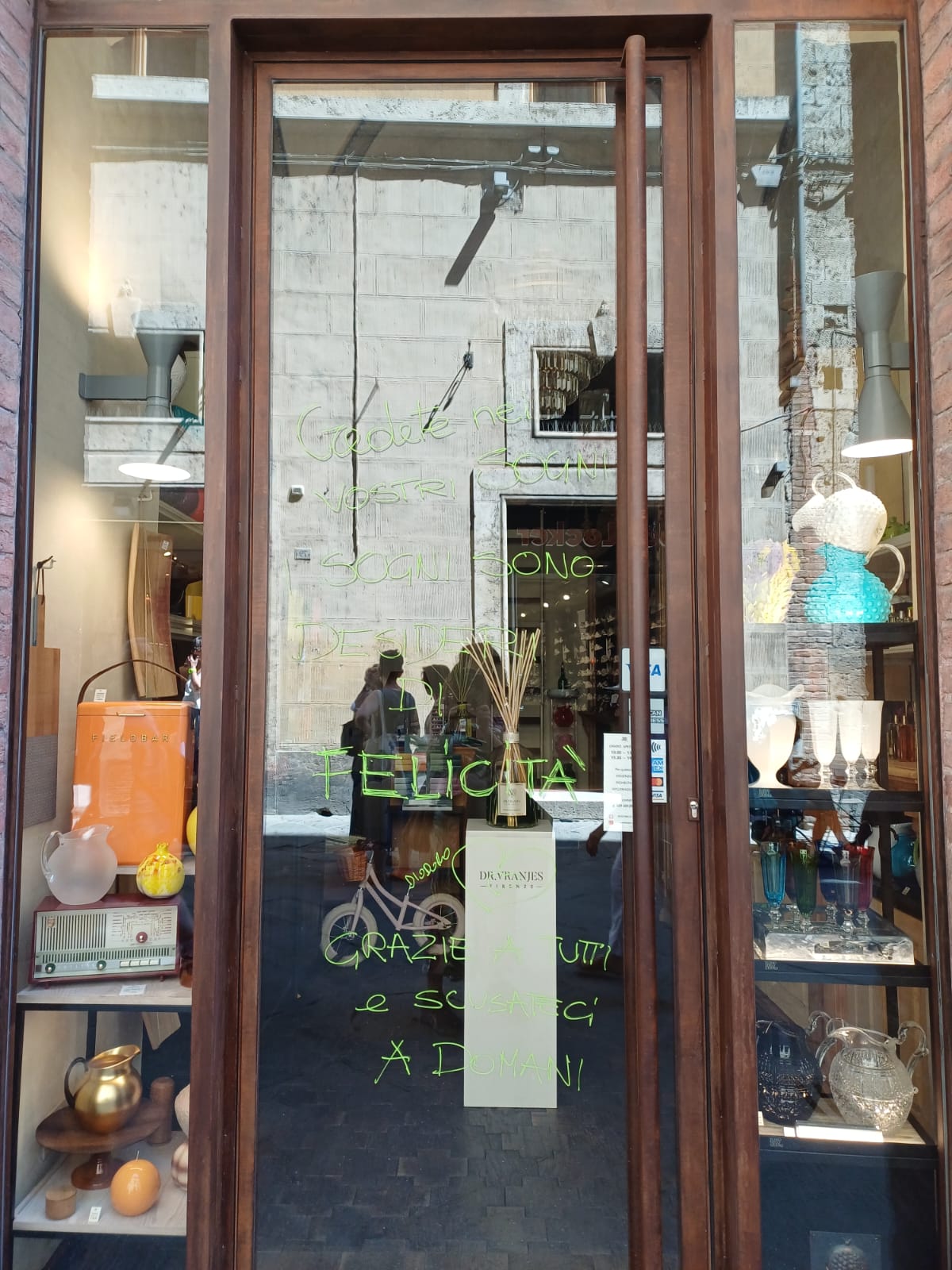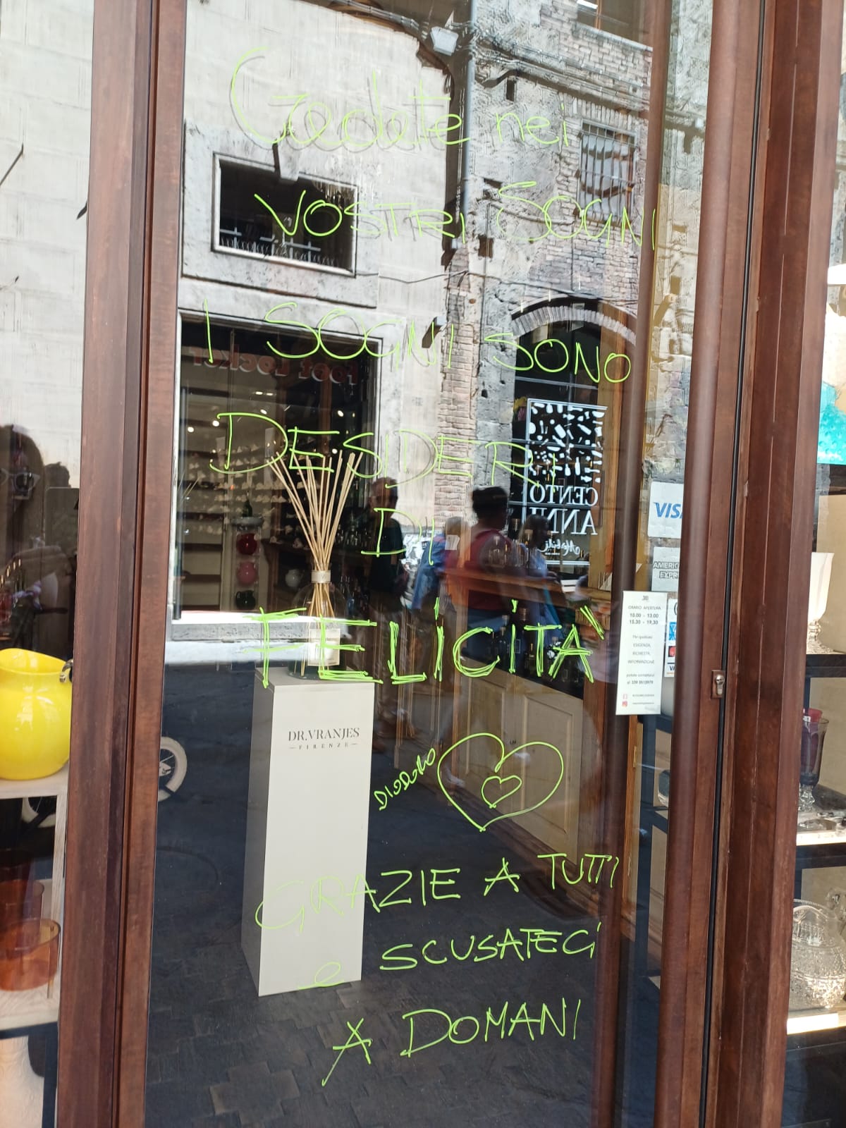 Rimarrà chiuso per un giorno, il negozio di Marco Tansini, nel cuore di Siena. Un gesto semplice ma carico di significato, il giorno dopo la Carriera di Provenzano. Niente clienti, niente luci accese, nessuna routine per un giorno. Solo un messaggio scritto sulla porta a vetro dell’ingresso: “Credete nei vostri sogni, i sogni sono desideri di felicità”.
