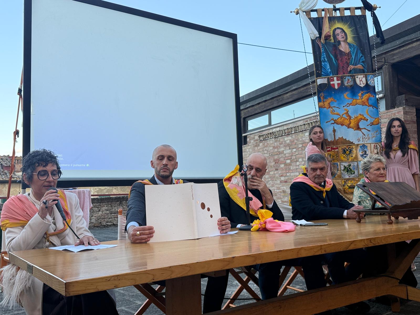 La pubblicazione celebra una vittoria voluta e costruita. Dal sopra a tutto giubilante che si apre al cielo, depositario dei nostri sogni e nel quale la Contrada del Montone è stata trasportata, il Numero Unico con coerenza si struttura attorno a concetti forti e canonici: l’intensità generativa del giubilo, la potenza della corsa, il senso di appartenenza, la fierezza di un popolo.