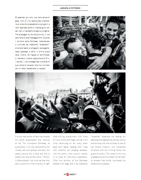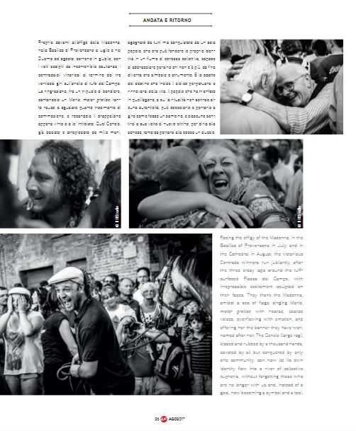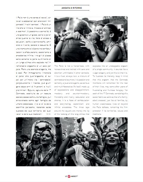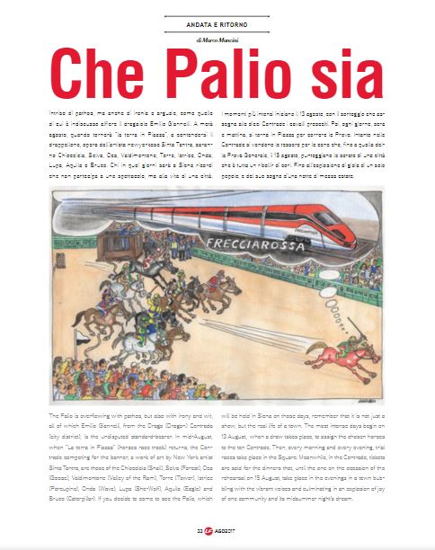 La rivista delle Ferrovie italiane “La Freccia” del mese di agosto dedica ben sei pagine al Palio di Siena, letto da Marco Mancini, senese, in una chiave meno convenzionale e illustrato in un bianco e nero. L’articolo è corredato da foto di gioia ed esultanza per la vittoria, il tutto accompagnato da una graffiante e simpatica illustrazione del re dei vignettisti, il senese e contradaiolo del Drago, Emilio Giannelli.