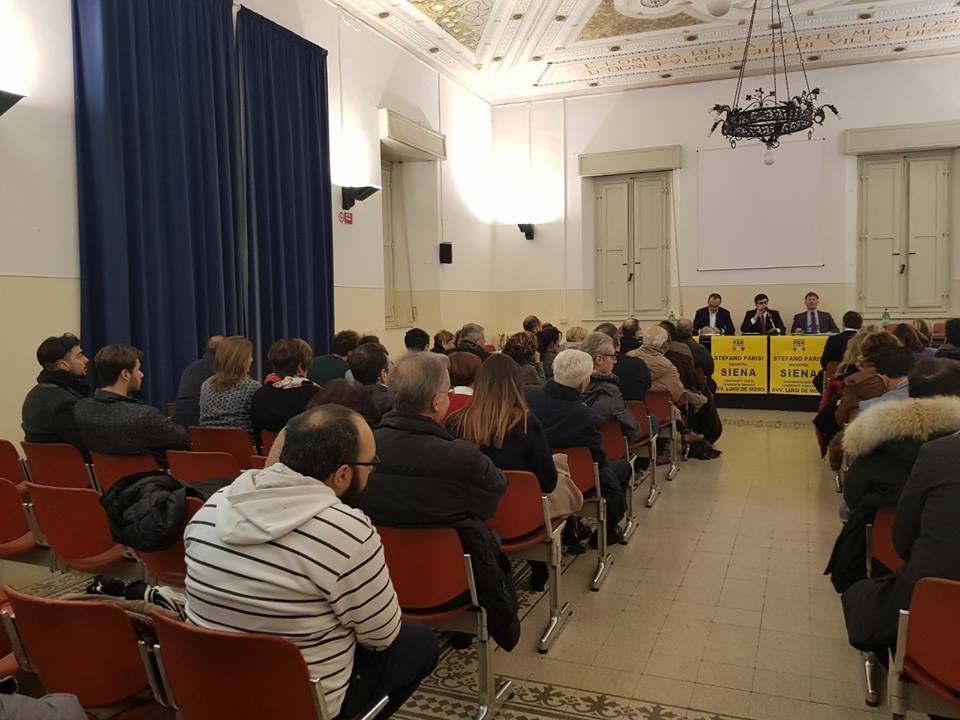 Spazio poi al primo grande progetto: “Credo che sia necessario permettere alle persone di vivere il centro storico al meglio. E devono poter arrivare in centro – ha spiegato De Mossi – con facilità. Per questo ho in mente la realizzazione di una tranvia che colleghi la stazione con lo stadio. Credo nella pedonalizzazione del centro che non dovrà però limitare i diritti dei residenti e dei commercianti. Sembra forse un sogno irrealizzabile ma non lo è! A Siena, quando c’erano i soldi grandi progetti non sono stati fatti. Oggi non ci sono, e sarà quindi necessario accedere ai finanziamenti europei. Voglio infatti per Siena un collegamento di collaborazione con l’Europa. Non è facile, non è semplice e non è veloce, ma dobbiamo iniziare a confrontarci con tutte le possibilità che l’Europa può darci. Io ci credo e – conclude De Mossi . sono certo che il 2018 sarà l’anno del nuovo inizio”.