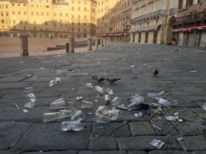 Ha fatto molto discutere, e continuerà a farlo, l’inciviltà dei molti che ogni weekend inondano Piazza del Campo di bicchieri e contenitori di plastica dopo le nottate di movida, trasformandola spesso in una discarica a cielo aperto. Uno spettacolo certamente indecoroso, non degno della bellezza di un luogo così unico. A tal proposito arriva la interessante idea di Andrea Pagliantini, cittadino della provincia di Siena, blogger e fotografo, che propone ai commercianti locali di dare i bicchieri dietro il pagamento di una cauzione da restituire all’uscita, così da impedire l’abbandono selvaggio.