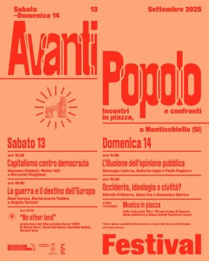 Quattro grandi temi, una piazza e due giorni per pensare insieme. Il 13 e 14 settembre torna a Monticchiello (SI) il festival “Avanti, Popolo!”, giunto alla sua terza edizione. In programma quattro incontri aperti e gratuiti su alcuni dei nodi più urgenti del nostro tempo: la guerra in Europa, il rapporto tra capitalismo e democrazia, l’opinione pubblica nell’epoca degli algoritmi, l’identità dell’Occidente. A questi si aggiungerà la proiezione del film premio Oscar “No other land”, amara riflessione sul conflitto israelo-palestinese, e un finale di musica in piazza. Tutto a ingresso libero. Apertura della Taverna di Bronzone per i pasti.