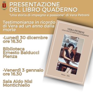 La figura di Vera Petreni sarà ricordata in un modo partecipato e originale, attraverso, cioè, la presentazione del libro-quaderno, “Vera Petreni, una vita di impegno e di passione”.