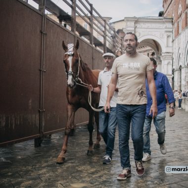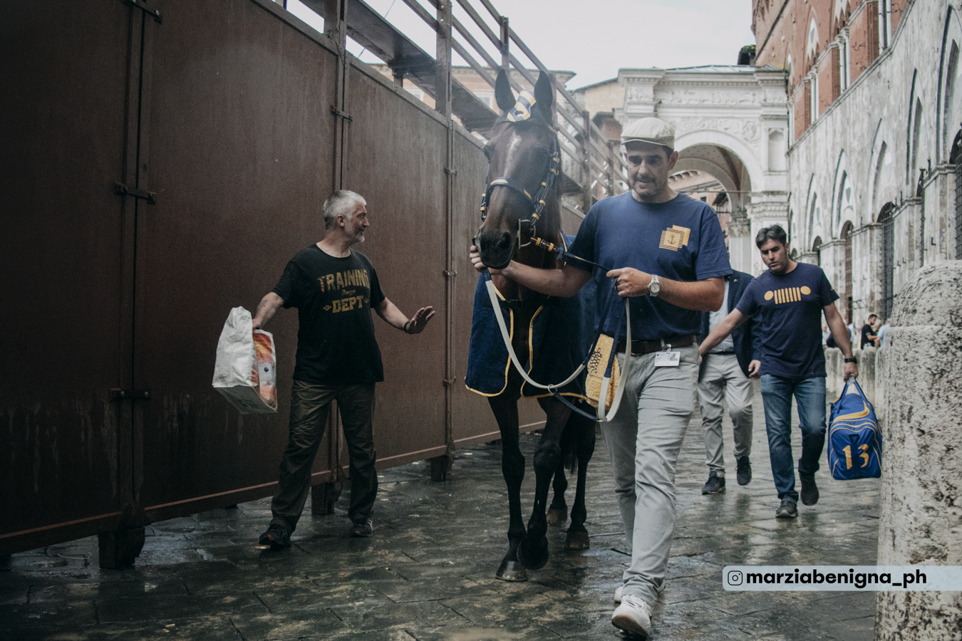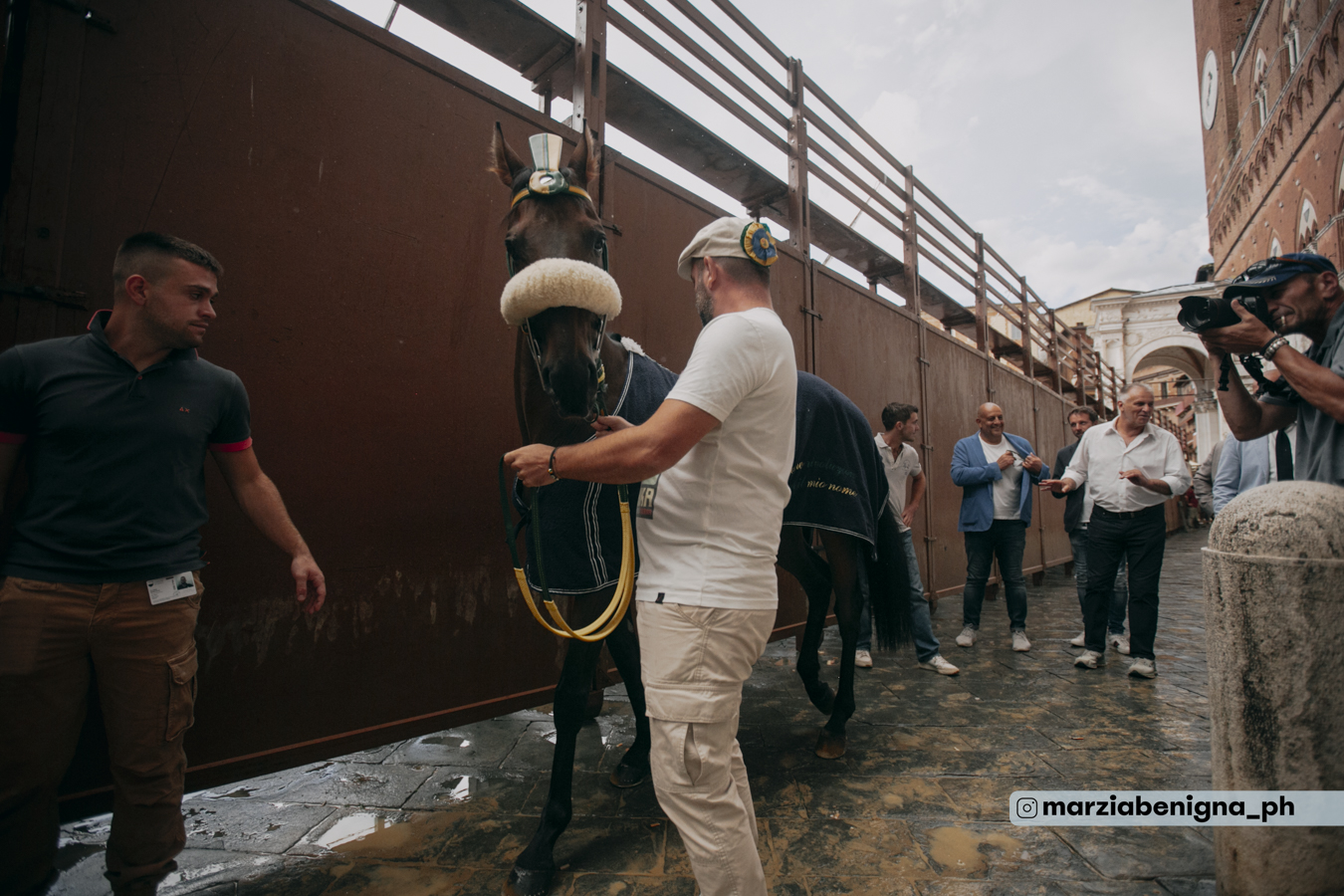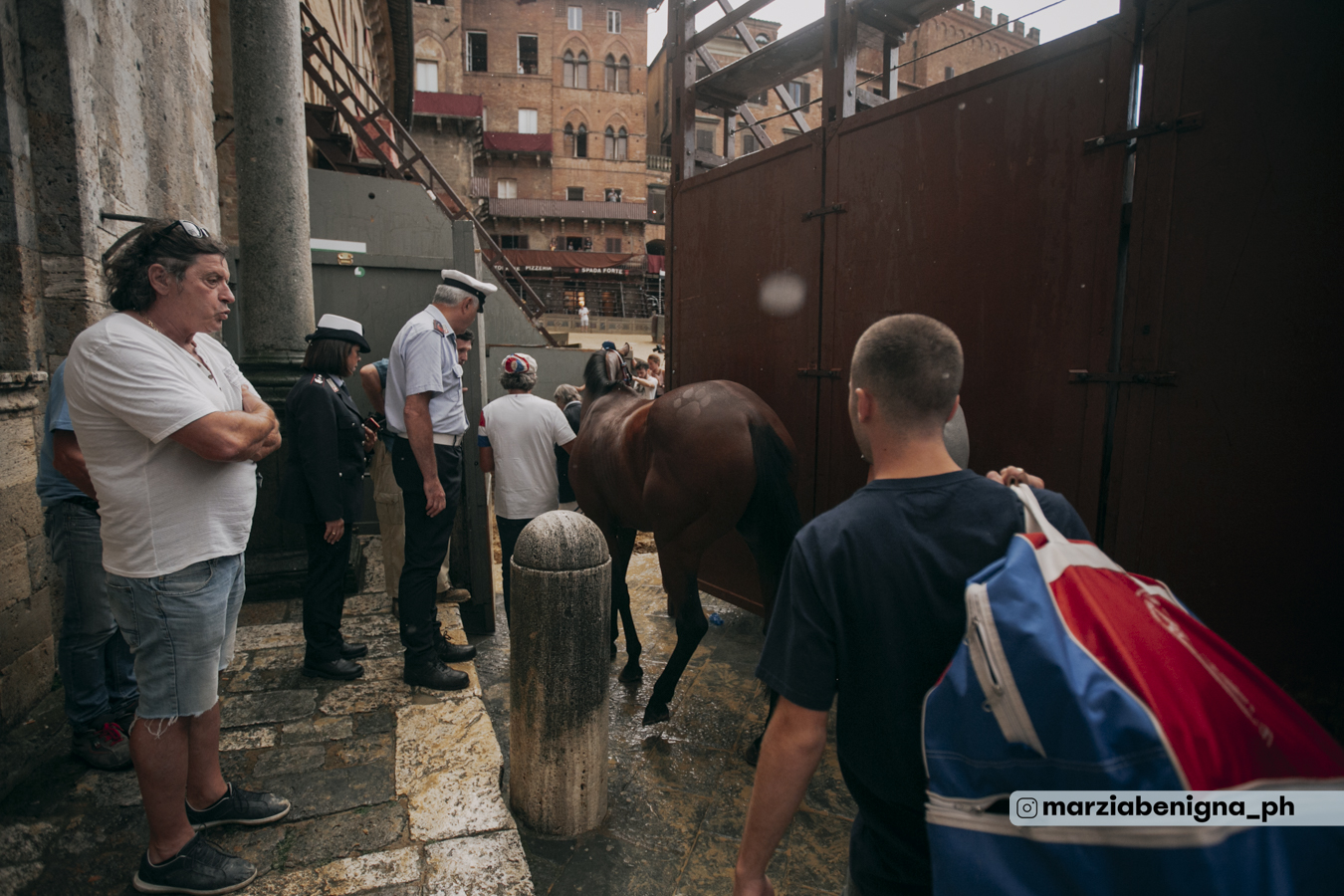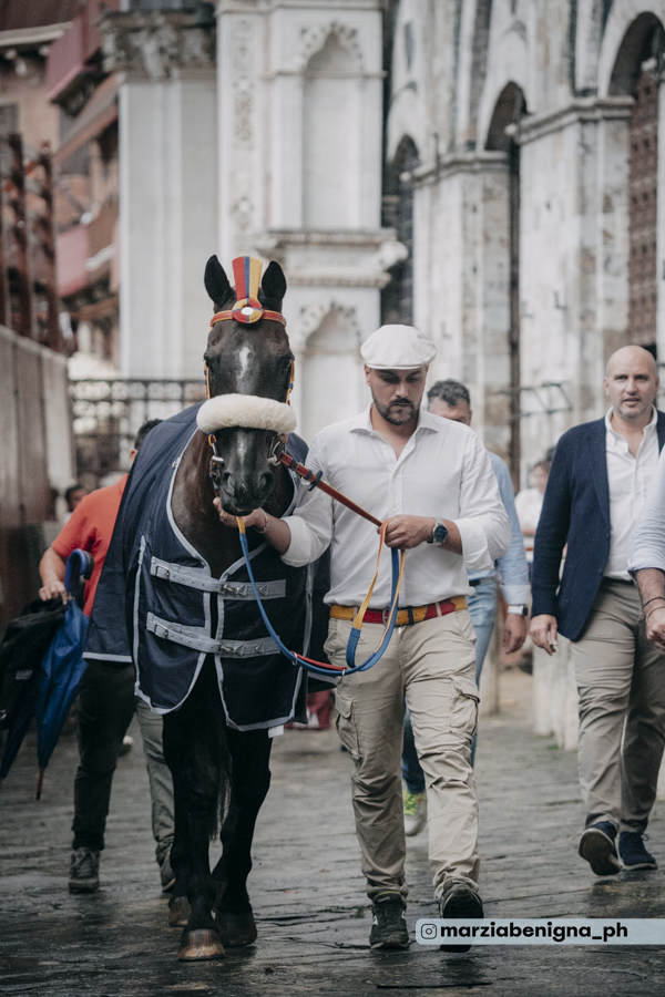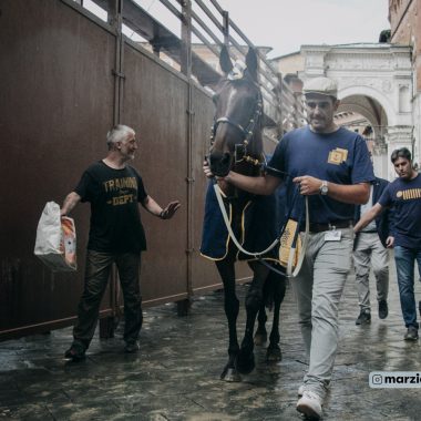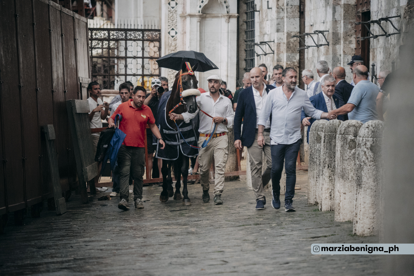 Un nubifragio che si è abbattuto su Piazza del Campo nel pomeriggio, ha sconvolto il programma del Palio, costringendo all’annullamento della terza prova (ed anche della quarta di domani mattina). I dieci cavalli, che avevano già raggiunto l’entrone sono rimasti bloccati per oltre un’ora e poi sono usciti da Via Duprè, in ordinata fila indiana. Nella nostra gallery alcuni scatti per raccontare questo pomeriggio rivoluzionato dalla pioggia.