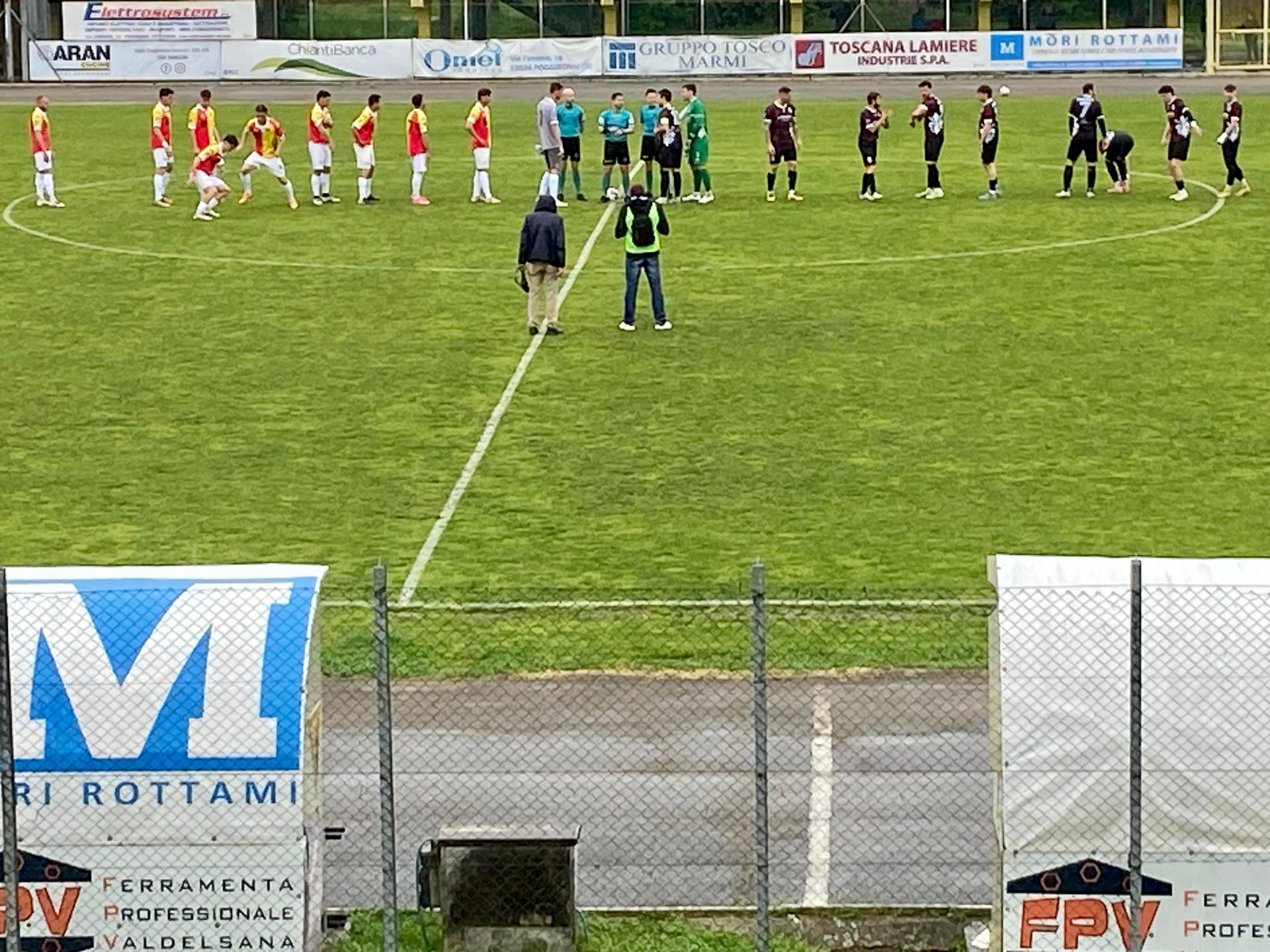 Piove a dirotto in Valdelsa, e come il pallone scivola via sul prato verde del Lotti, il primo tempo tra le due squadre scivola verso lo zero a zero. Prima del duplice fischio, Bellini di testa ha una buona chance. Ma appunto si rimane inchiodati sul risultato a reti bianche.