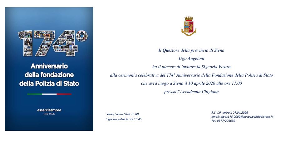 A seguire, alle 11.00, si terrà la cerimonia ufficiale presso l’Accademia Musicale Chigiana, alla presenza del Prefetto Valerio Massimo Romeo e delle principali autorità cittadine. Parteciperanno tutte le componenti della Polizia di Stato della provincia di Siena, insieme all’ANPS.