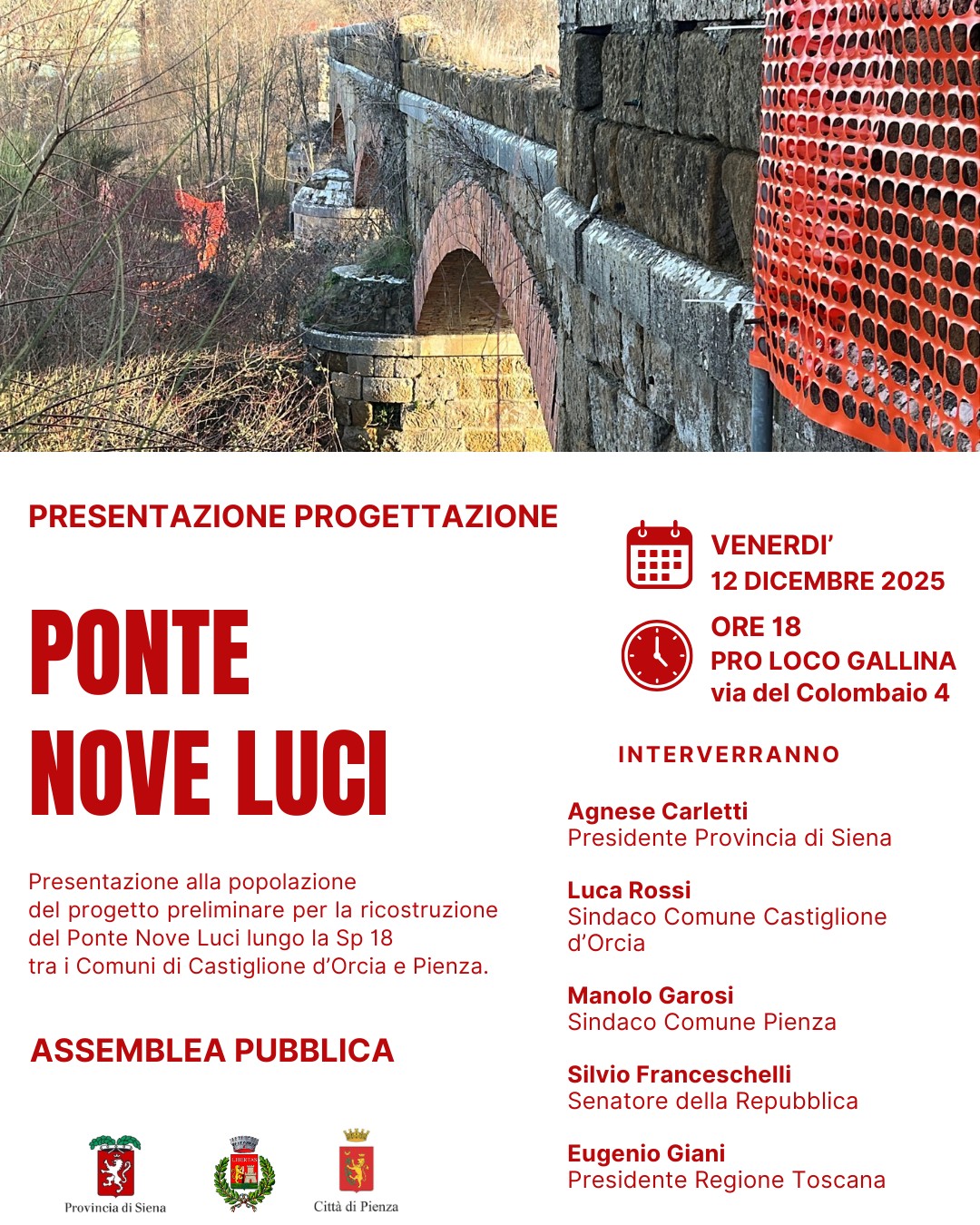 A confermare l’inizio della nuova fase è l’assemblea pubblica in programma venerdì 12 dicembre 2025 alle ore 18 nella sede della Pro Loco di Gallina, a Castiglione d’Orcia. Durante l’incontro verrà presentato alla popolazione il documento con la progettazione di fattibilità del nuovo ponte, primo passo operativo del percorso che porterà la Provincia di Siena alla realizzazione dell’opera.