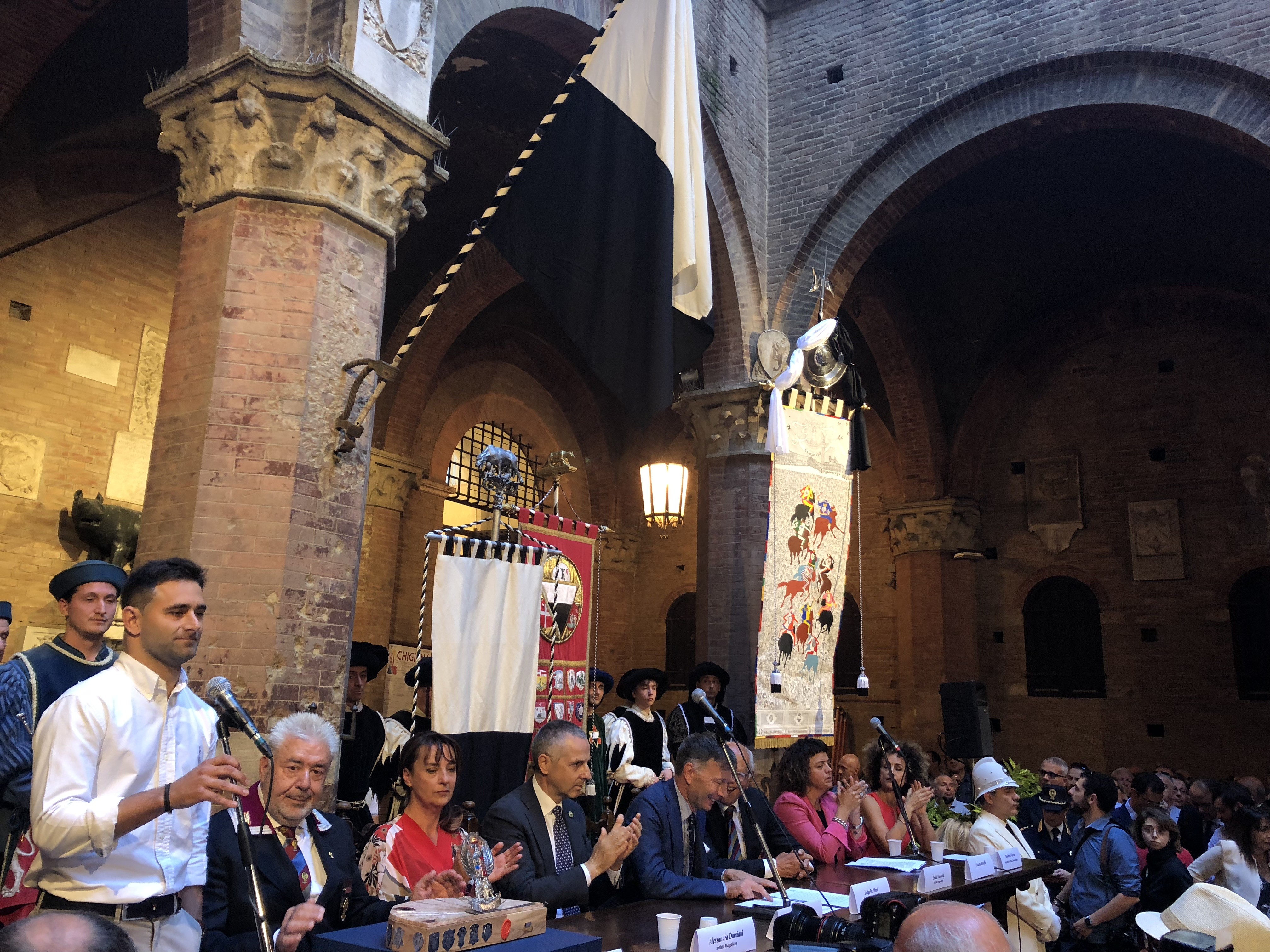 Questo il discorso di Matteo Fontani: “Il Masgalano di quest’anno, ideato e realizzato dall’orafa senese Alessandra Damiani, è stato offerto dall’Associazione Nazionale Polizia di Stato di Siena in occasione del proprio cinquantenario. La scelta ponderata di donare questo significativo premio alla migliore comparsa da parte dell’Associazione, deriva senza dubbio dal profondo rapporto che lega da sempre la Polizia alla città e alla manifestazione stessa del Palio. D’altronde L’ANPS, fin dalla sua nascita, si è prodigata con forza e dedizione al servizio e alla tutela non solo dei propri iscritti, ma di tutta la cittadinanza con svariate opere di volontariato, soprattutto in ambito sociale e previdenziale. Nel corso nel 2015, spinto dal suo sincero affetto verso Siena, l’ex Presidente Giorgio Morganti, purtroppo prematuramente scomparso, si fece fautore dell’iniziativa, in seguito vigorosamente sostenuta dalla moglie Barbara Manganelli e dall’attuale Presidente Alessandro Vitarelli”.