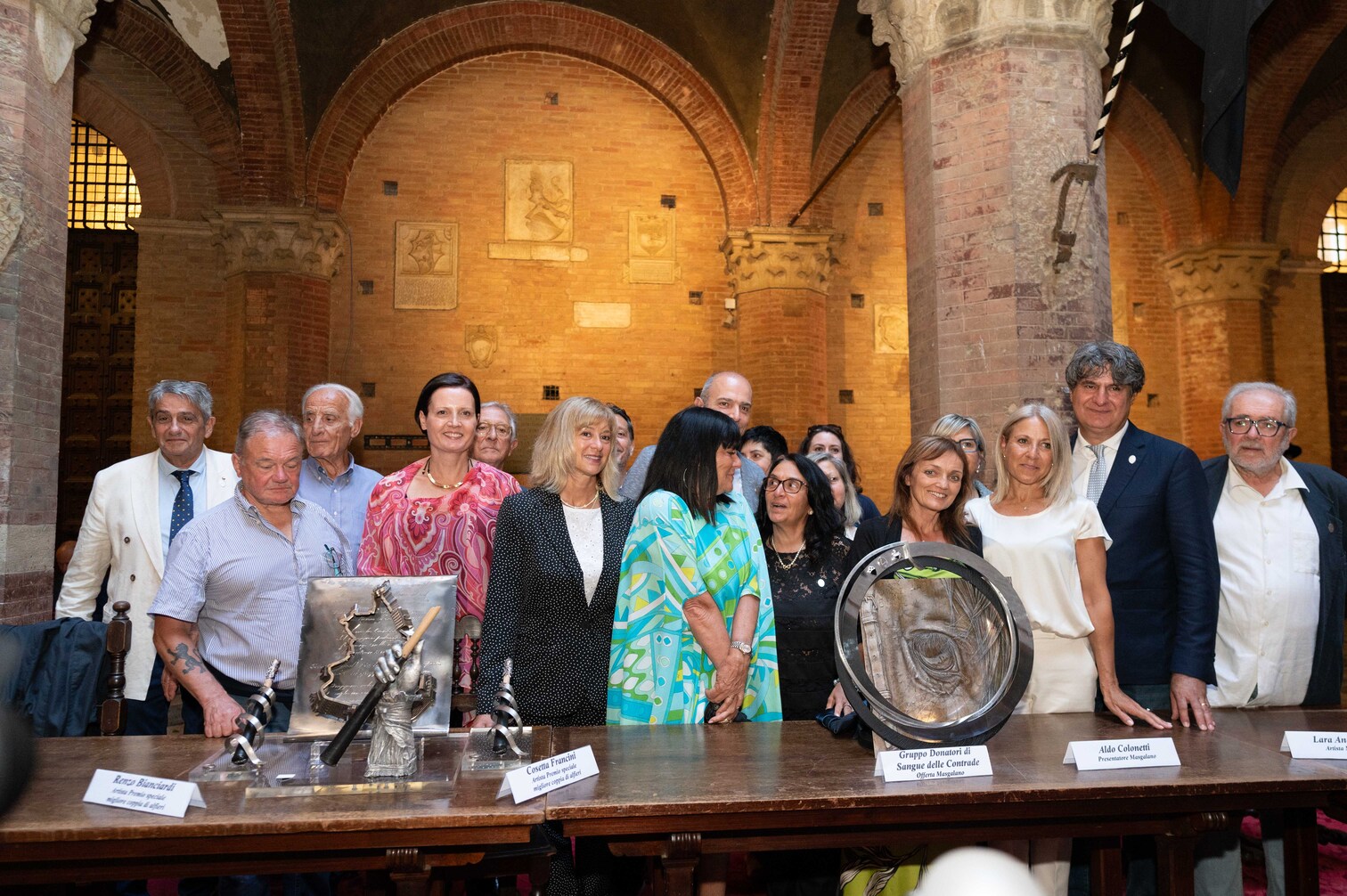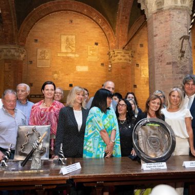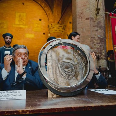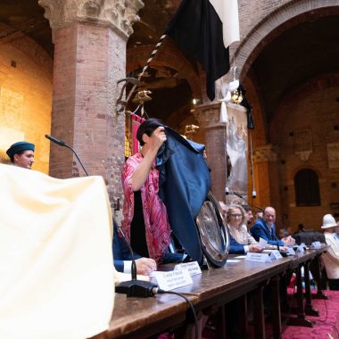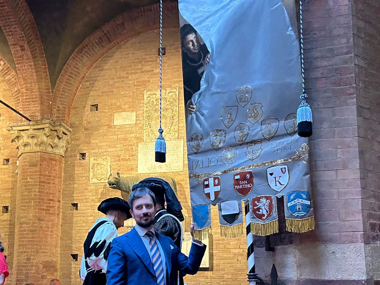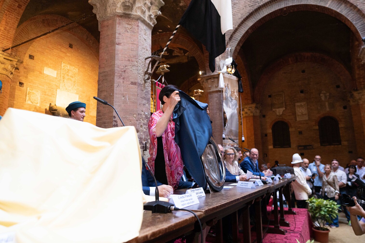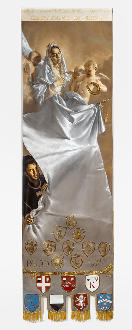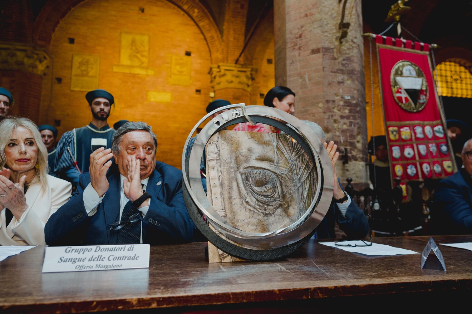 Nella nostra gallery alcune immagini della presentazione del drappellone del Palio di luglio 2024 realizzato da Giovanni Gasparro.