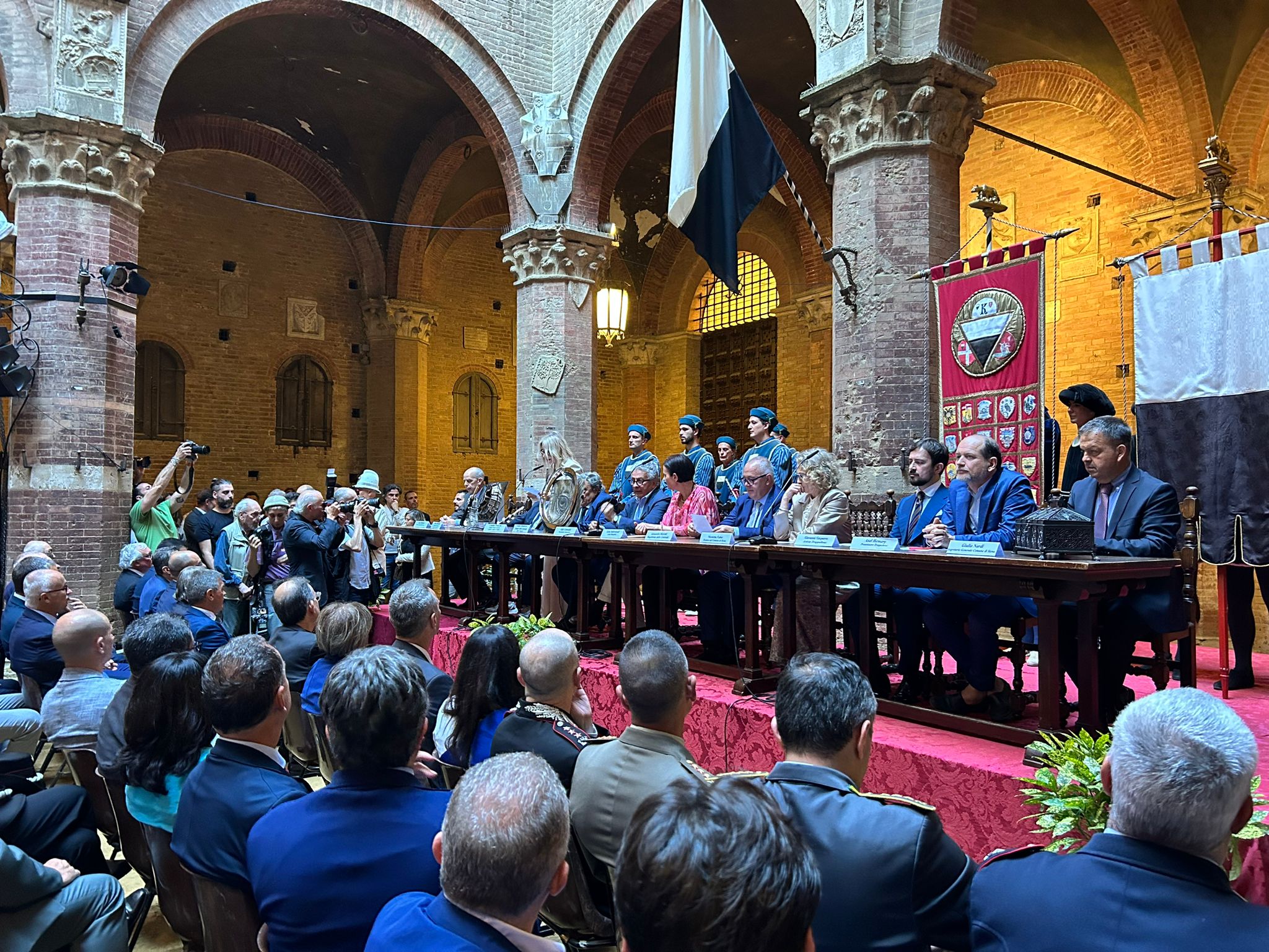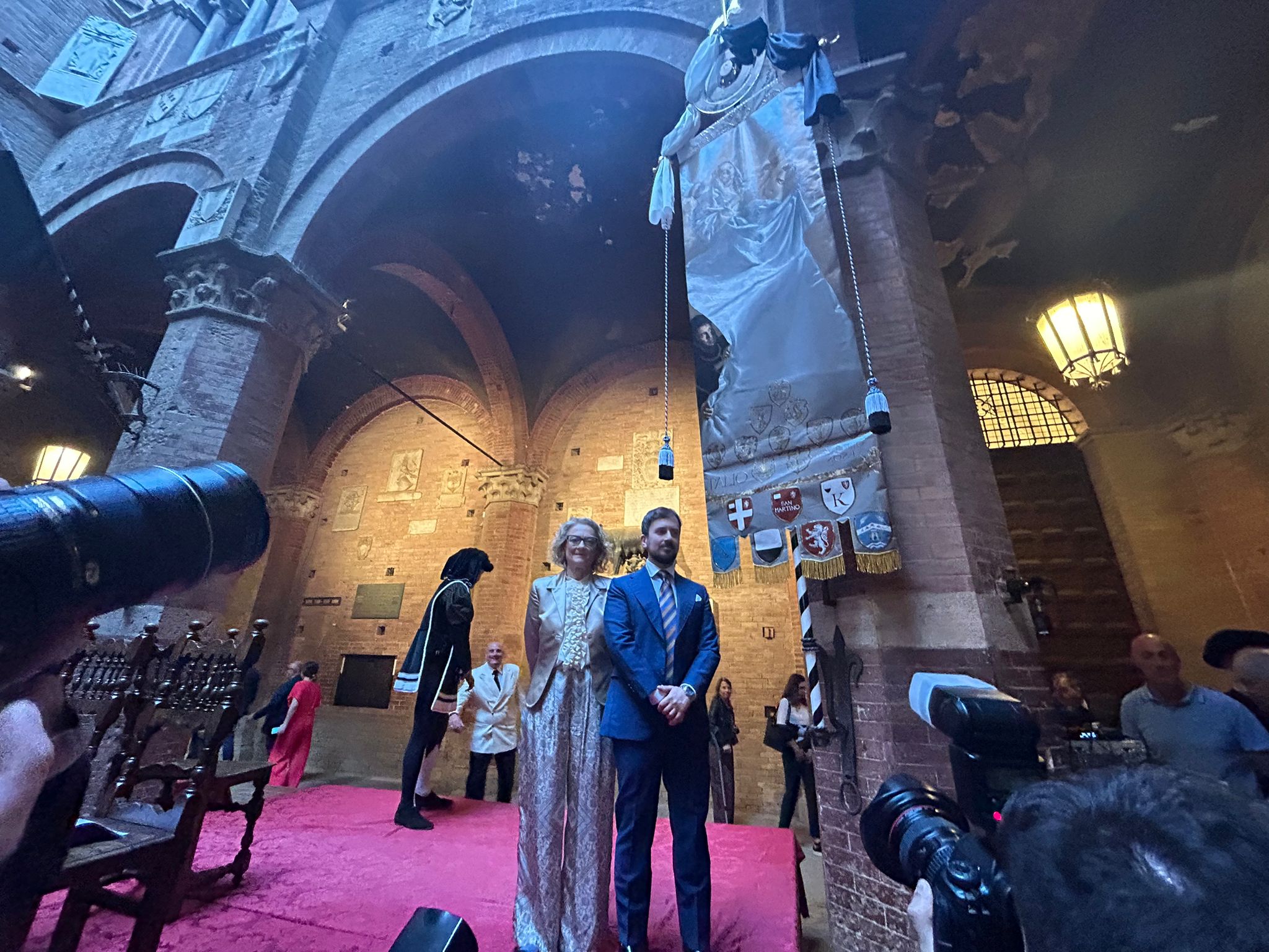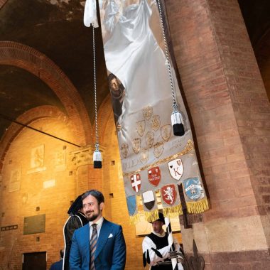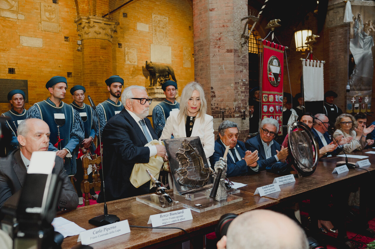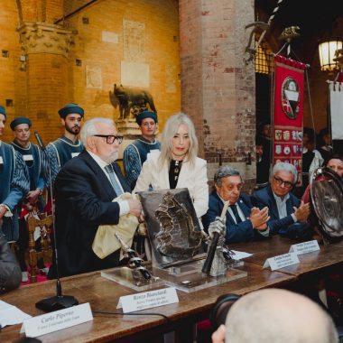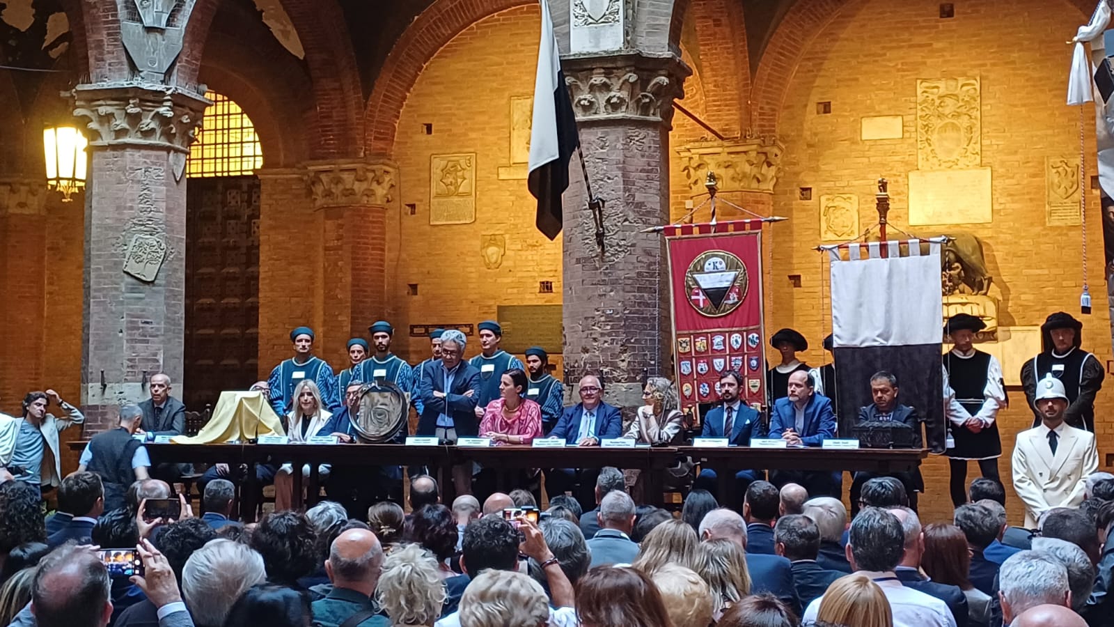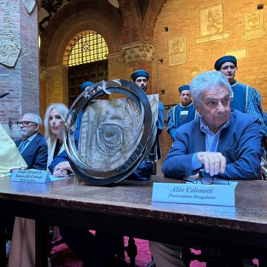Nella nostra gallery alcune immagini della presentazione del drappellone del Palio di luglio 2024 realizzato da Giovanni Gasparro.