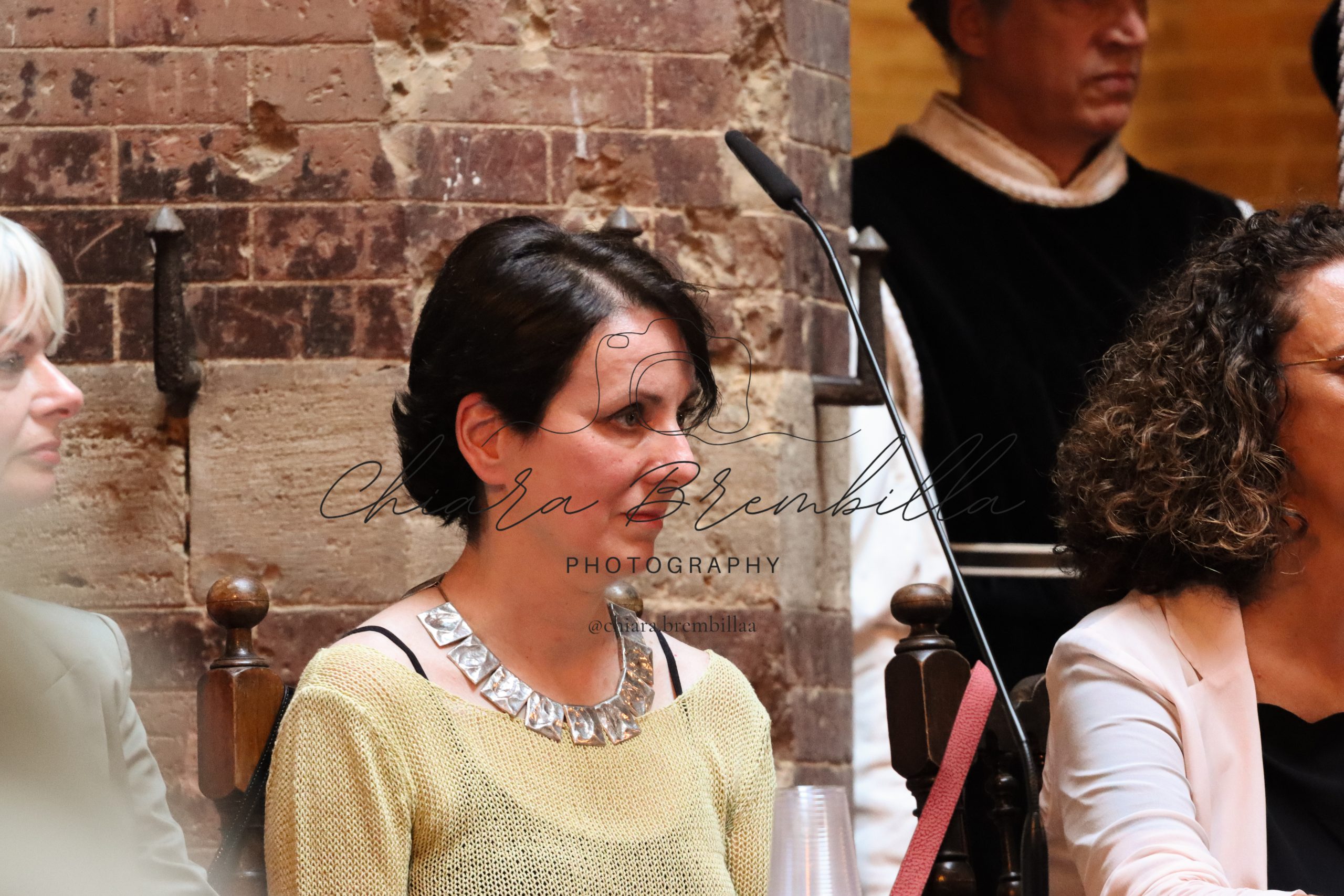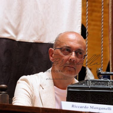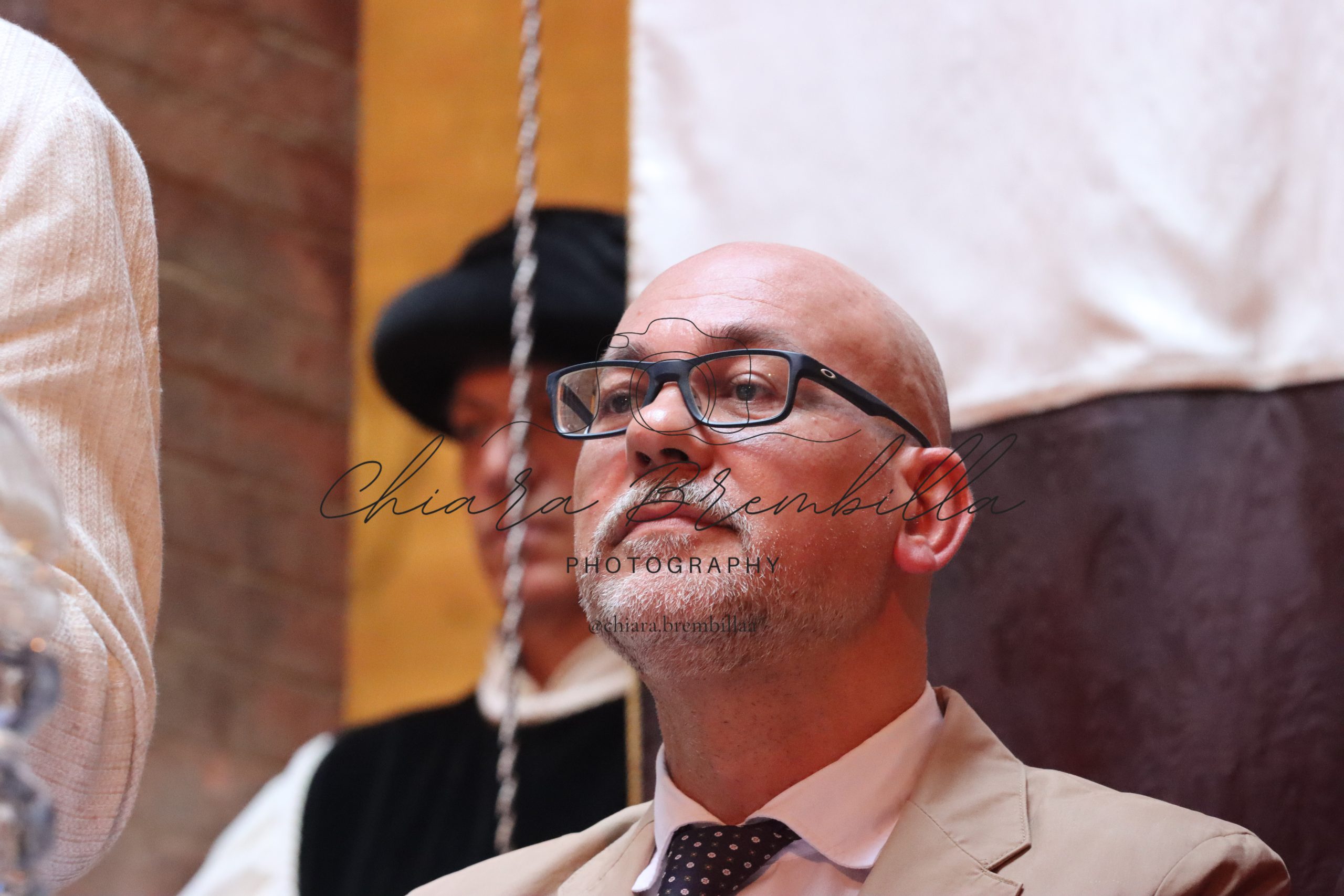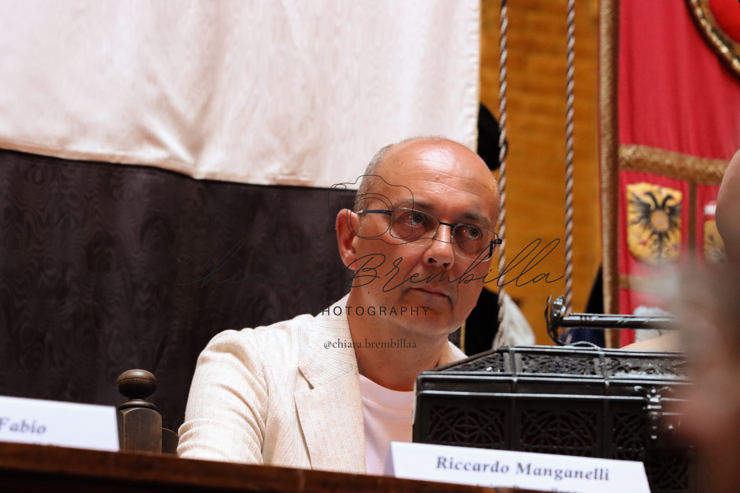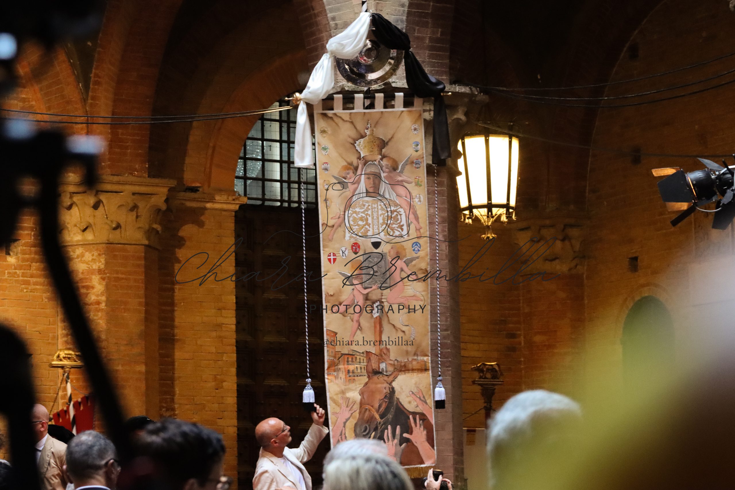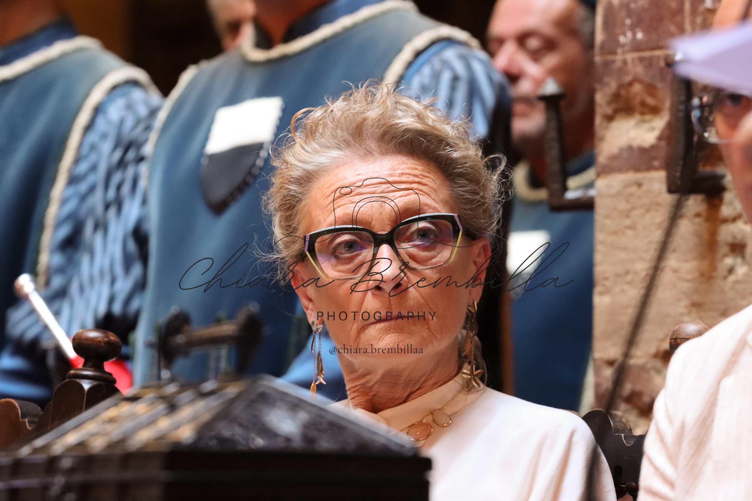 Un applauso convinto ha accolto il drappellone di Riccardo Manganelli, che è stato svelato durante il consueto e suggestivo appuntamento nel Cortile del Podestà. Nelle nostre immagini, scattate da Chiara Brembilla, alcuni momenti della presentazione