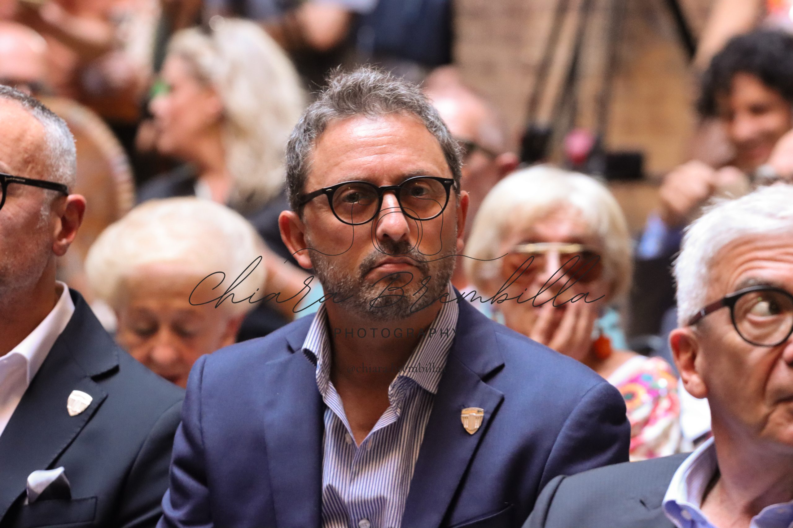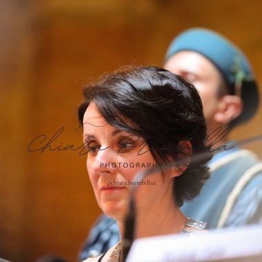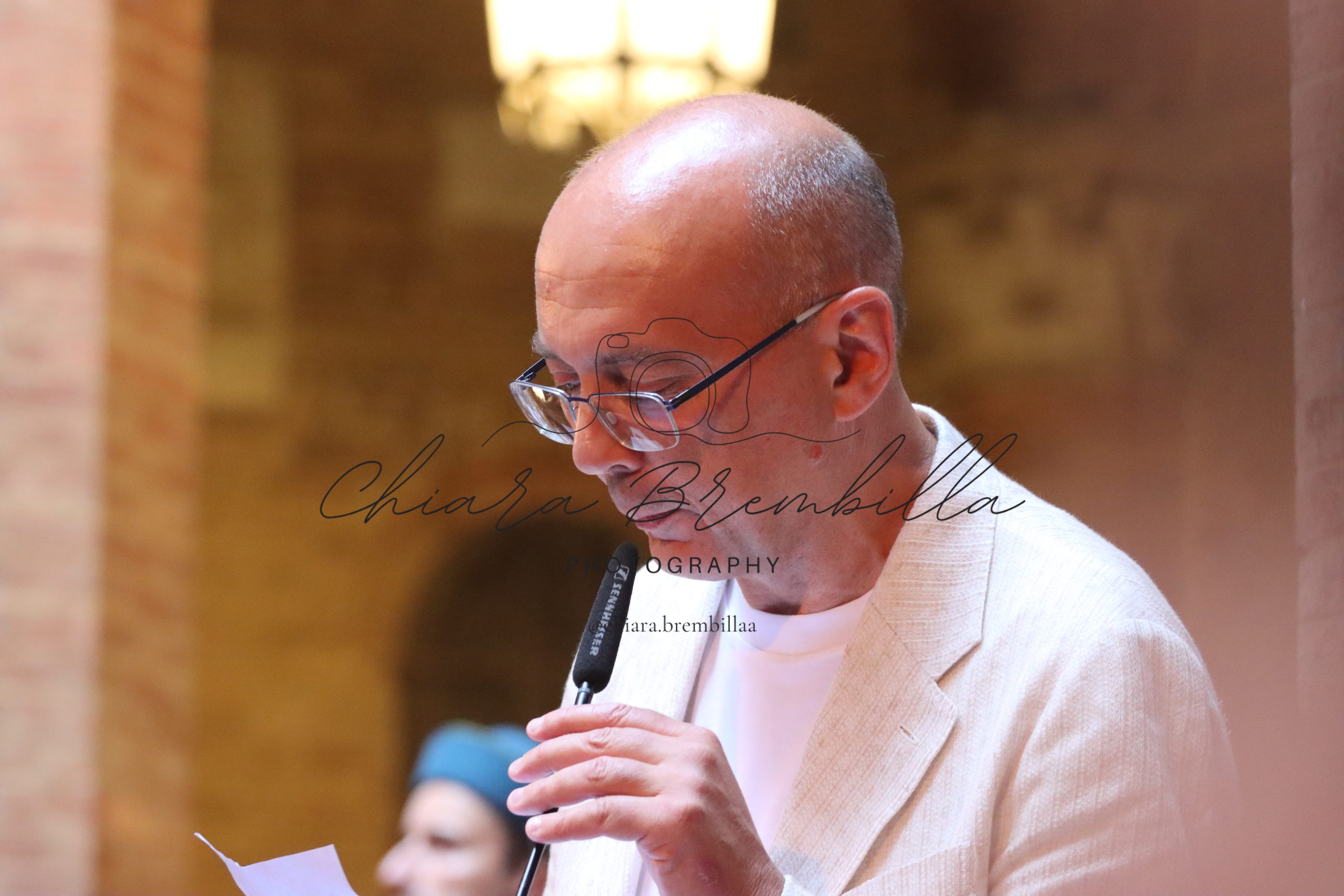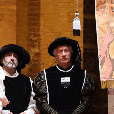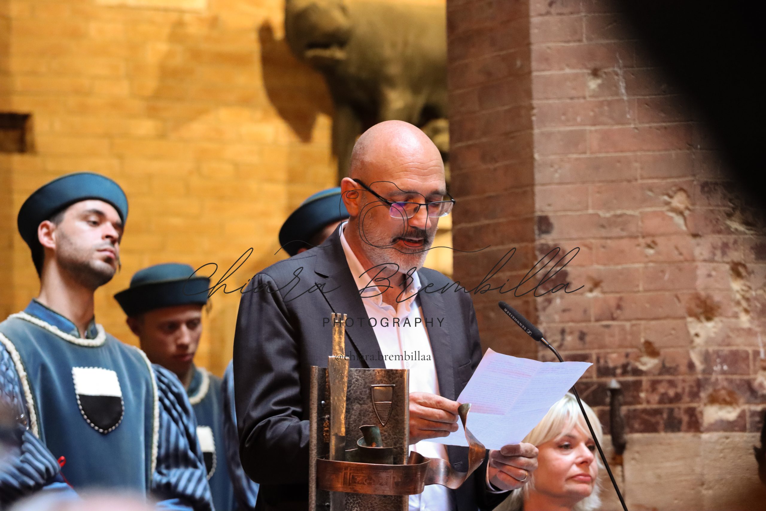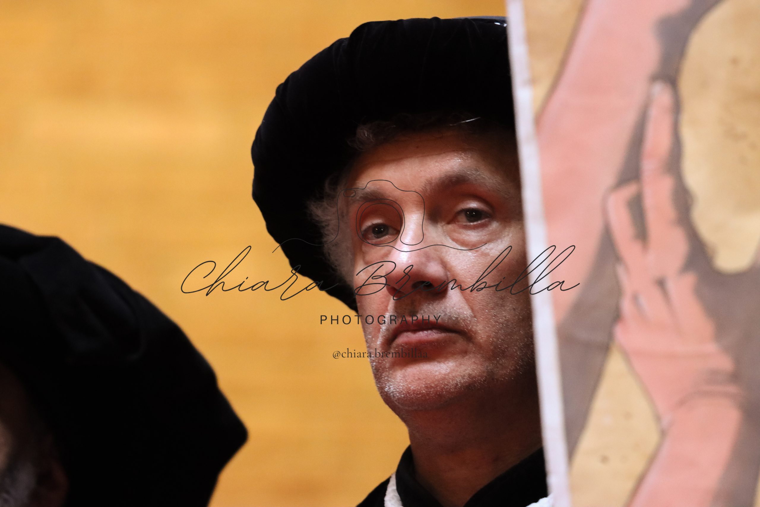 Un applauso convinto ha accolto il drappellone di Riccardo Manganelli, che è stato svelato durante il consueto e suggestivo appuntamento nel Cortile del Podestà. Nelle nostre immagini, scattate da Chiara Brembilla, alcuni momenti della presentazione