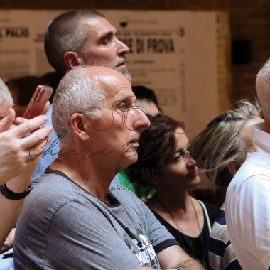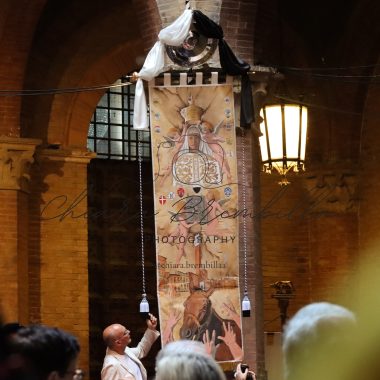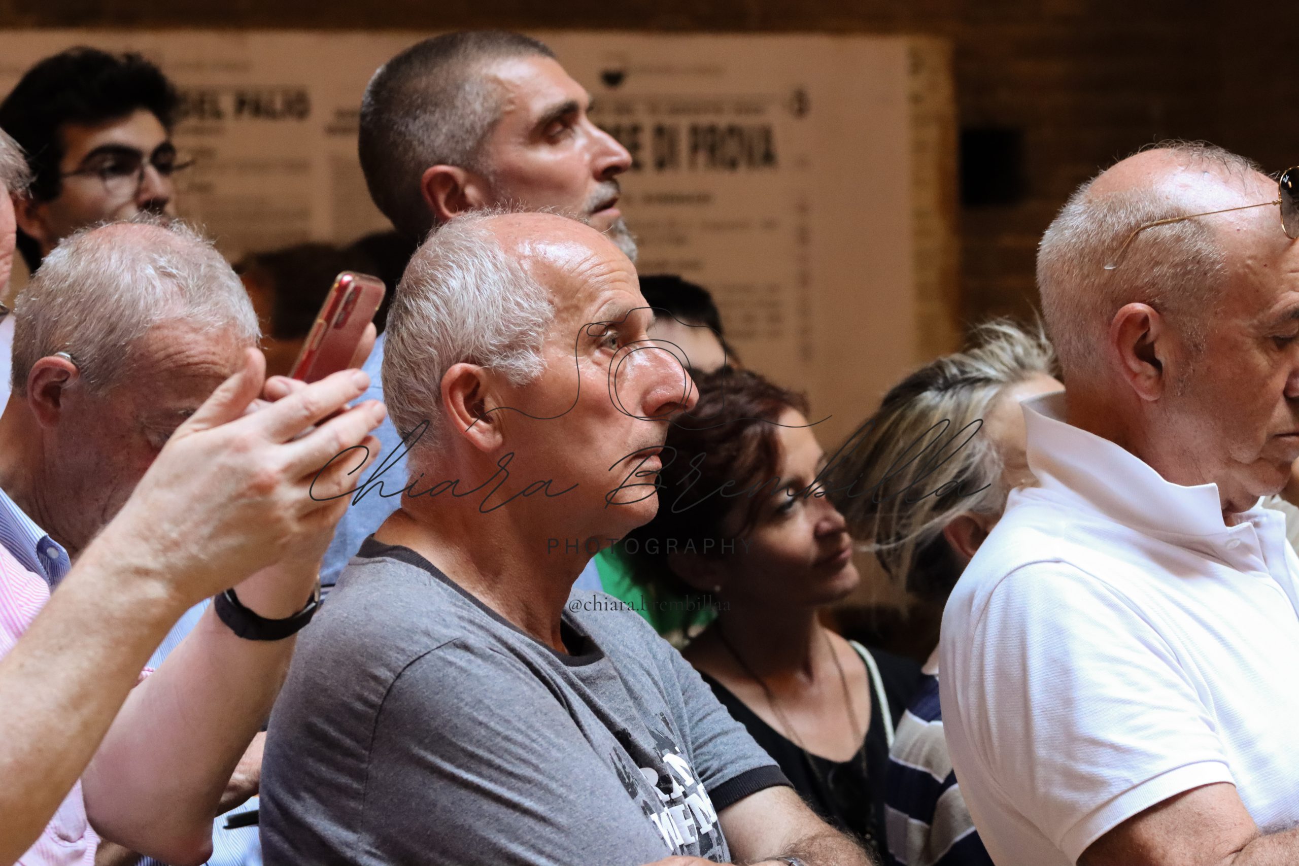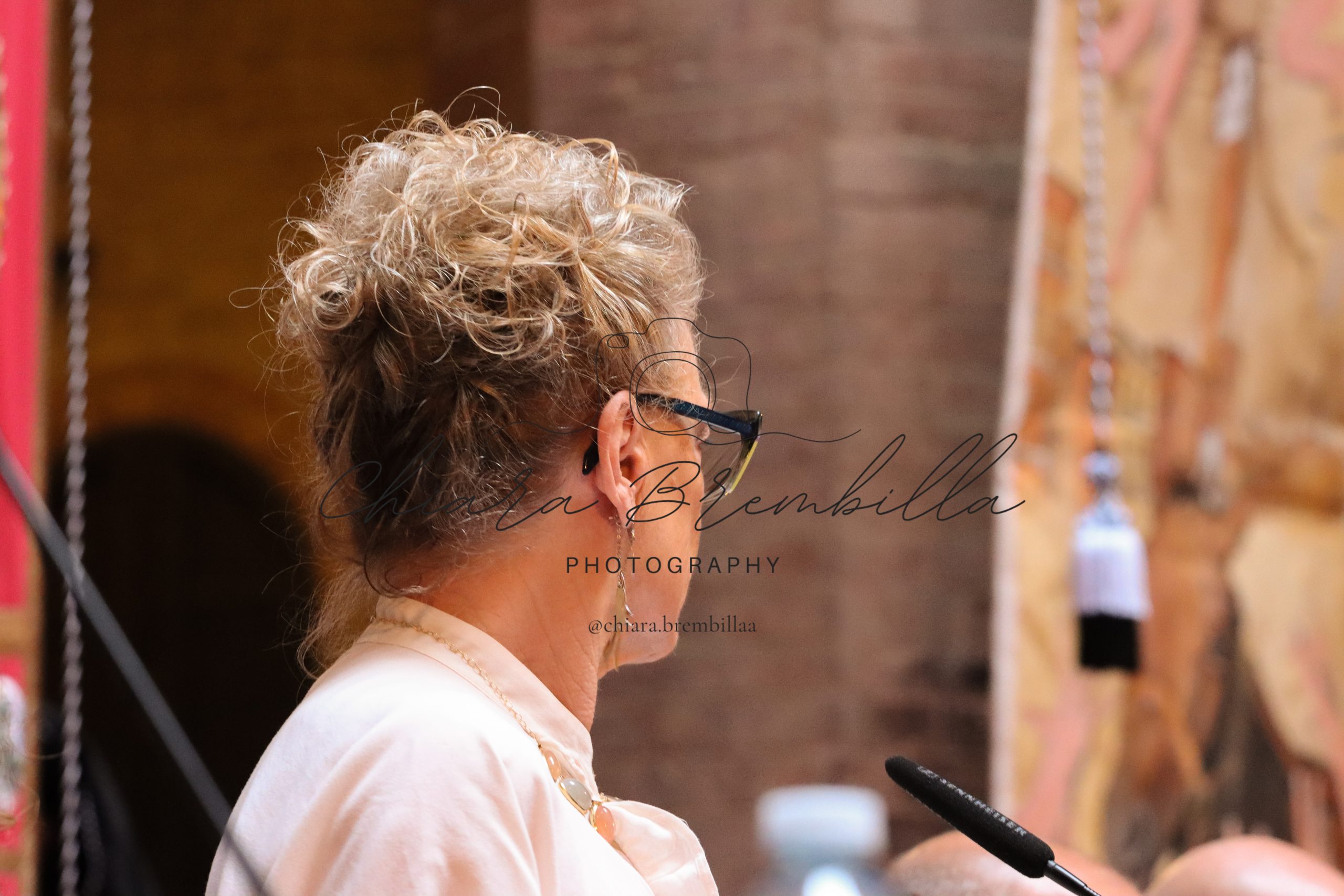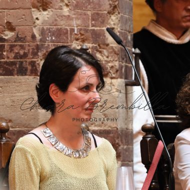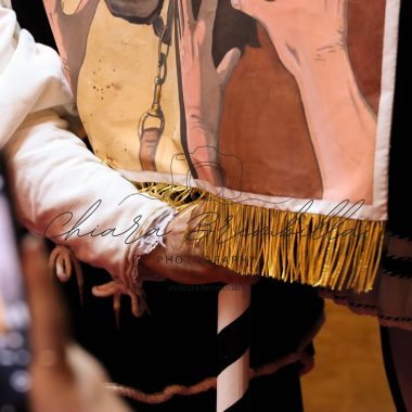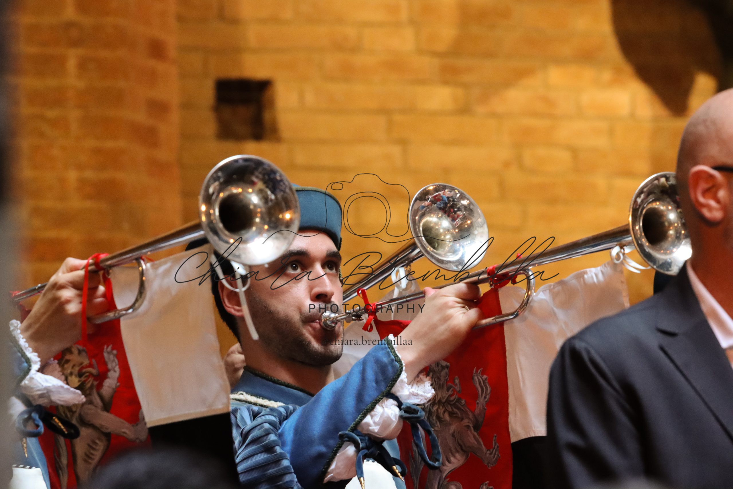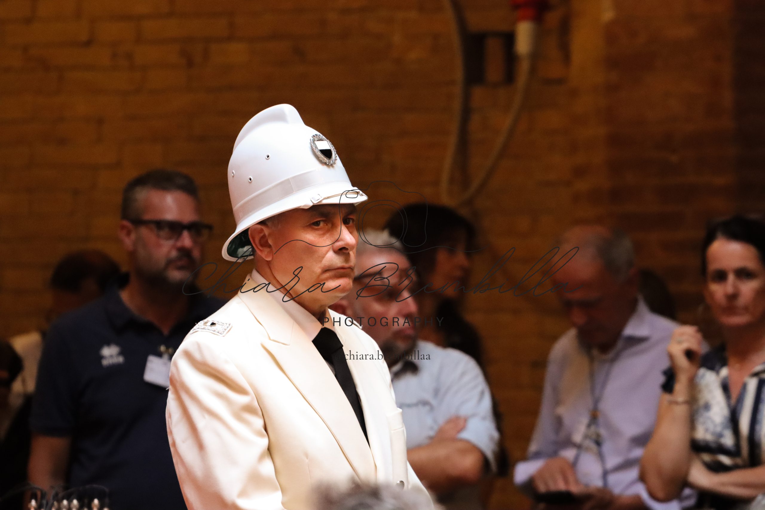Un applauso convinto ha accolto il drappellone di Riccardo Manganelli, che è stato svelato durante il consueto e suggestivo appuntamento nel Cortile del Podestà. Nelle nostre immagini, scattate da Chiara Brembilla, alcuni momenti della presentazione