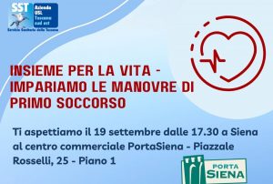 Cosa fare davanti a un arresto cardiaco in corso? Le manovre di primo soccorso sono fondamentali per salvare chi sta male. Per farle conoscere, l’Azienda Usl Toscana Sud Est ha organizzato un’iniziativa di formazione aperta al pubblico che si terrà martedì 19 settembre, dalle 17.30, al primo piano della Galleria PortaSiena di Piazzale Rosselli a Siena.