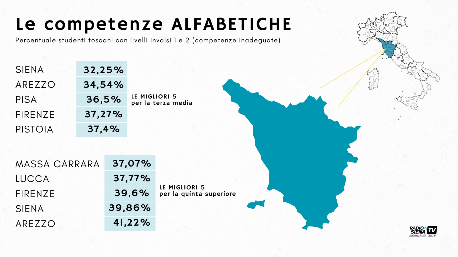 I risultati dei test invalsi ci restituiscono una panoramica della provincia di Siena nella quale il 32,2% degli alunni delle medie e il 39,8% di quelli delle superiori non raggiunge il livello di competenza ritenuto adeguato (livello tre) in italiano.