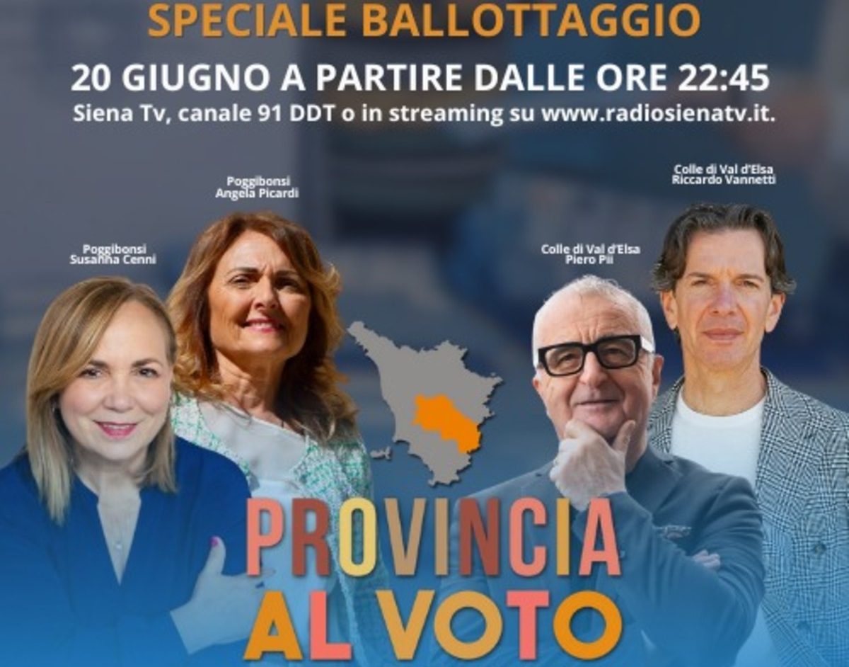 Puntata speciale con i due Comuni della Provincia di Siena che domenica 23 e lunedì 24 giugno andranno al ballottaggio per scegliere il proprio Sindaco. Puntata unica e speciale con i due candidati di Colle di Val d’Elsa: Piero Pii (candidato civico sostenuto dalle liste Su per Colle, Colle Domani, Piero Pii Sindaco) e Riccardo Vannetti (candidato di centrosinistra sostenuto dalle liste PD, la Sinistra per Colle, Uniti per Colle Val d’Elsa con PSI e +Europa, Ri-Generazione, Colle per Vannetti Sindaco) e le due candidate di Poggibonsi: Susanna Cenni (candidata di centrosinistra sostenuta dalle liste PD, Futura Susanna Cenni Sindaca, Uniti per Poggibonsi con Poggibonsi Viva, PSI, +Europa) e Angela Picardi (candidata di centrodestra sostenuta dalle liste Fratelli d’Italia; Lega; Lista Picardi Sindaco con FI, UdC e PLI; Poggibonsi Merita).
