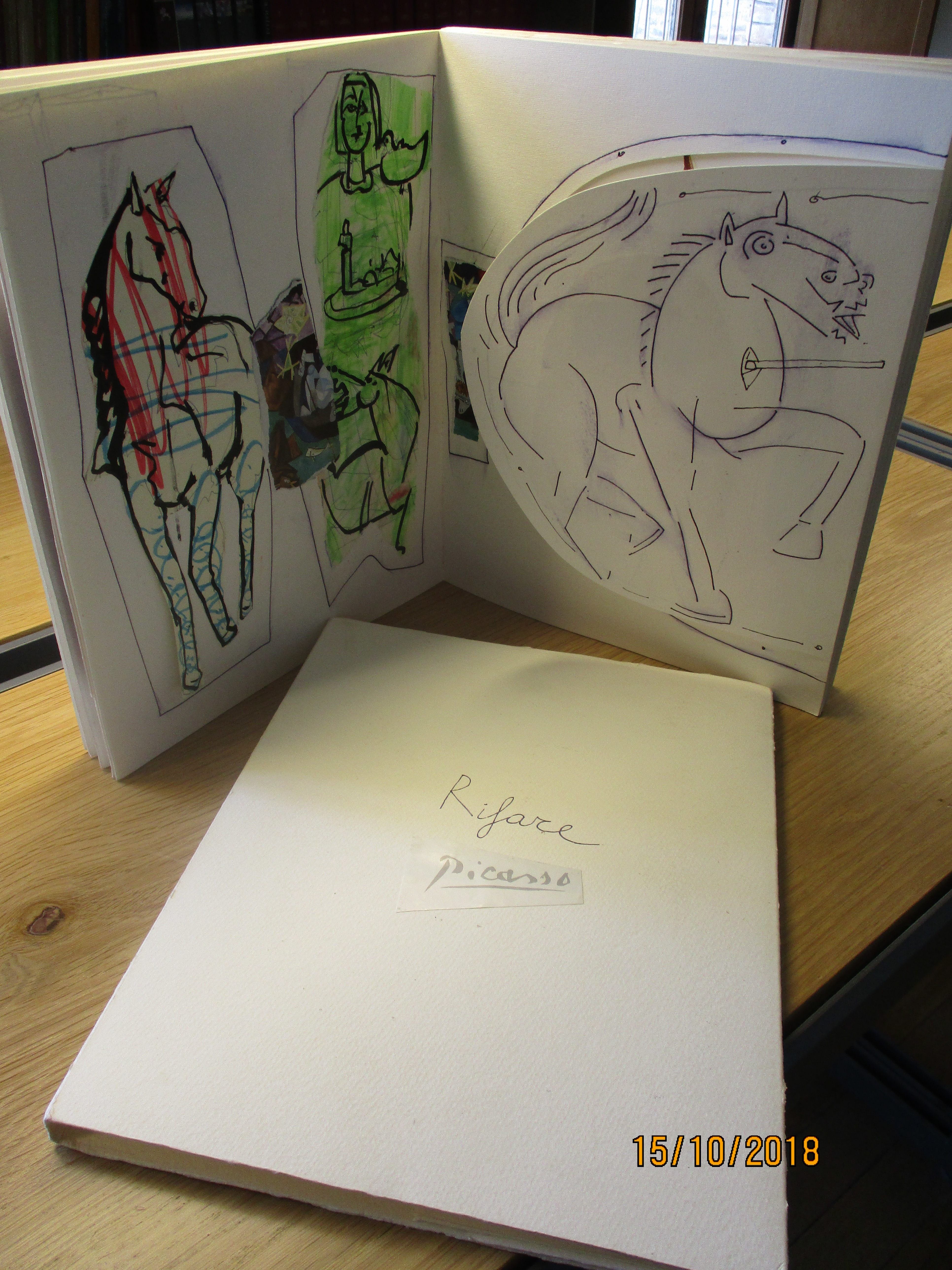 “Rifare Picasso” è un racconto di pura fantasia scritto nel 2004 dal giornalista e scrittore Vincenzo Coli e comparso al tempo su una rivista locale. Si ipotizzava che alla fine degli anni sessanta il comune di Siena avesse commissionato un drappellone a Pablo Picasso. Quel racconto ha avuto una storia curiosa. Qualche anno fa Fabio Mazzieri, pittore e animatore culturale molto apprezzato, autore del “cencio” del 2 luglio 1985, stava preparando Librartis, mostra del libro d’artista, manufatti sul tema in legno, carta, metalli e tessuti, e volle riesumare questa storia. Commissionò a Coli la riscrittura a pennarello su un quadernone di carta porosa stile primi Novecento e ne illustrò tutte le pagine, affidando le conclusive al talento di Cesare Olmastroni, pittore pure lui autore di due drappelloni, luglio 1982 e agosto 2013. La mostra, che ebbe un certo successo, viaggiò oltreatlantico fino al New Jersey, e quell’esemplare unico di libro ora è custodito insieme alle altre opere nella Biblioteca Giuliano Briganti al Santa Maria della Scala.