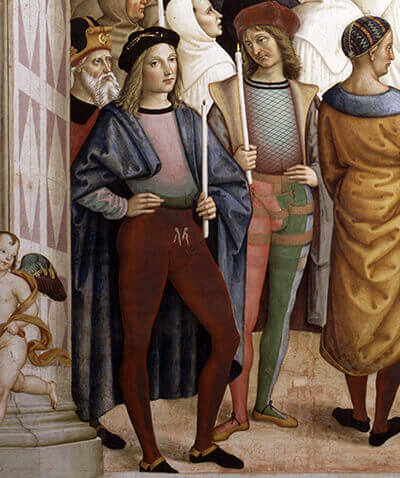 All’interno del ciclo della Libreria Piccolomini, nella scena della Canonizzazione di santa Caterina da Siena, tra il pubblico degli ordini religiosi, in basso a sinistra, spiccano le due figure in cui da tempo si riconoscono il giovane Raffaello (in calze rosse) con accanto il Pinturicchio stesso.