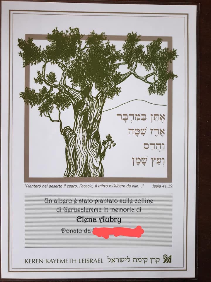 “Le storie belle esistono ed Elena non dimentica mai di propormene delle nuove – scrive – Mi chiamano e mi dicono che c’è qualcosa per me. Vado, apro la lettera e leggo che una Signora, una meravigliosa Signora di Siena ha incaricato una Associazione perché comprasse un albero, lo piantasse sulle colline di Gerusalemme e gli mettesse il nome di Elena. Sono rimasta… senza parole. Un gesto meraviglioso che fa parte di una usanza ebraica che ha un significato importante. Un pensiero, ancora più apprezzato perché viene da una tradizione e una religione che non è la mia e di Elena. Sto cercando di contattare questa meravigliosa persona. Un onore speciale, per Elena, per tutti noi. Un piccolo grande albero chiamato Elena crescerà sulle colline di una Terra Santa per moltissime persone e credi religiosi. Non so se mai riuscirò ad accarezzarlo ma questo gesto, questo “regalo” di affetto e stima da una persona che non conosco, l’ho trovato stupendo. Grazie, con tutto il cuore”.