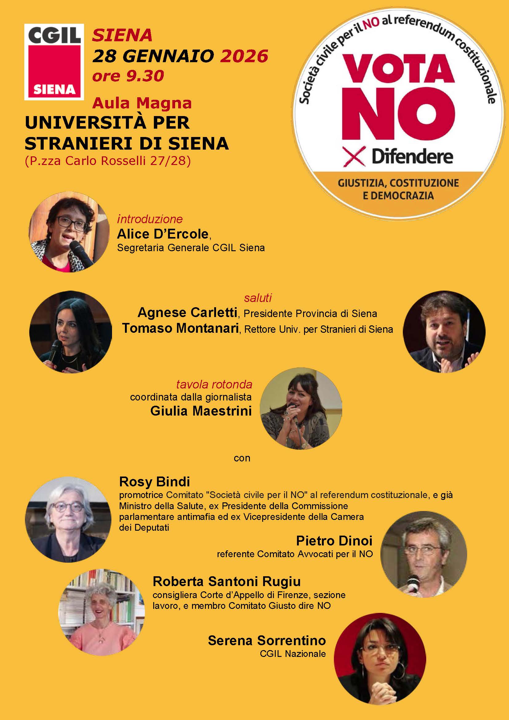 Difendere la Costituzione, la giustizia e la democrazia: è questo l’obiettivo dell’iniziativa pubblica promossa dalla CGIL di Siena nell’ambito della campagna referendaria per il NO al referendum costituzionale, in programma mercoledì 28 gennaio 2026 alle ore 9.30 presso l’Aula Magna dell’Università per Stranieri di Siena (Piazza Carlo Rosselli 27/28).
