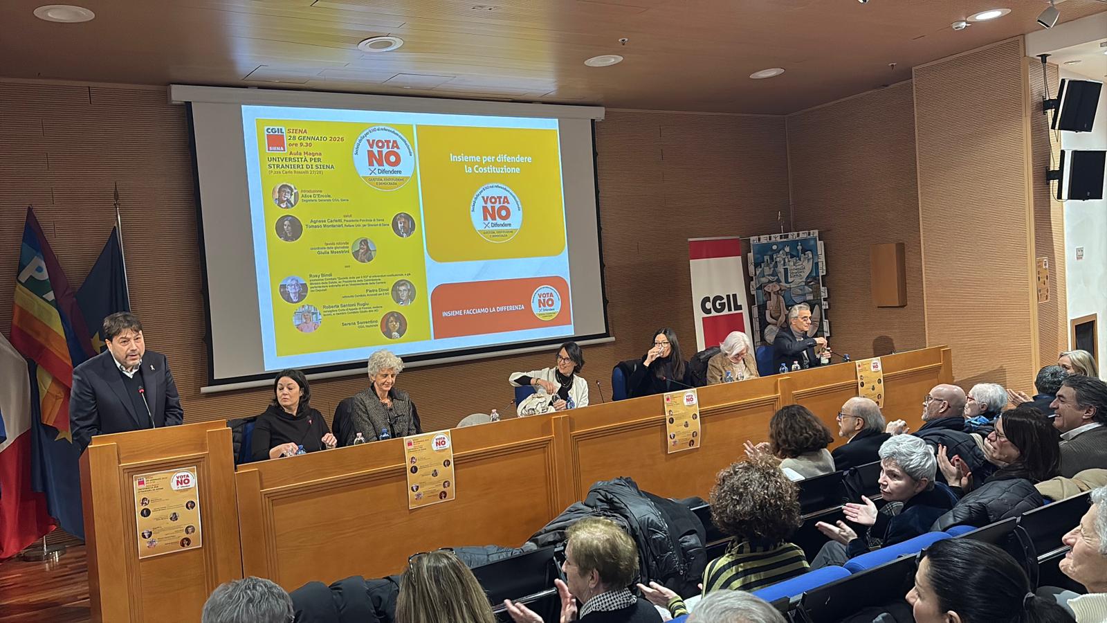 A introdurre i lavori è stata Alice D’Ercole, segretaria generale della Cgil di Siena. Saluti istituzionali della presidente della Provincia Agnese Carletti e del rettore dell’Università per Stranieri Tomaso Montanari. La tavola rotonda ha visto gli interventi di Rosy Bindi, promotrice del Comitato “Società civile per il no”, dell’avvocato Pietro Dinoi, della consigliera della Corte d’Appello di Firenze Roberta Santoni Rugiu e di Serena Sorrentino della Cgil nazionale.