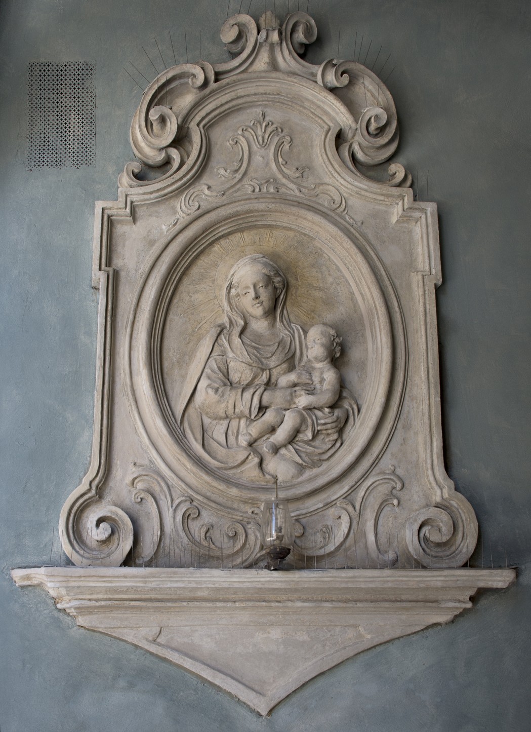 Il Tabernacolo fu fatto costruire, intorno al 1720, dal famoso cantante di voce bianca Francesco Bernardi, detto il Senesino. Non è noto l’autore di questa Madonna con il Bambino che è stata comunque definita come “vicina” ad analoghe composizioni coeve di provenienza dalla “bottega del Mazzuoli”.