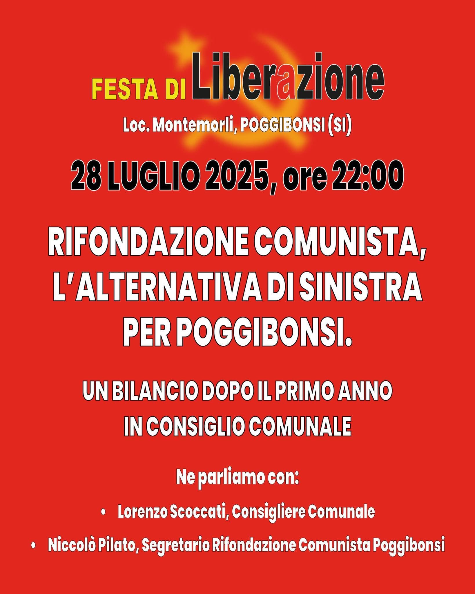 Lunedì 28 luglio (ore 22), nella cornice della festa di Liberazione di Montemorli, Rifondazione Comunista di Poggibonsi parlerà del primo anno di consiliatura.