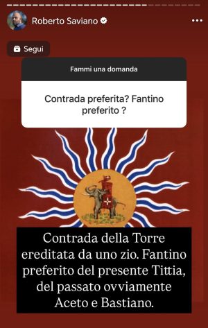 “La mia contrada di Siena preferita? La Torre”. Lo rivela lo scrittore e giornalista Roberto Saviano, rispondendo in una sua storia alla domanda di un utente su Facebook. Saviano spiega che ha ereditato la simpatia per la Torre da uno zio, e che il suo fantino preferito attualmente è Tittìa.