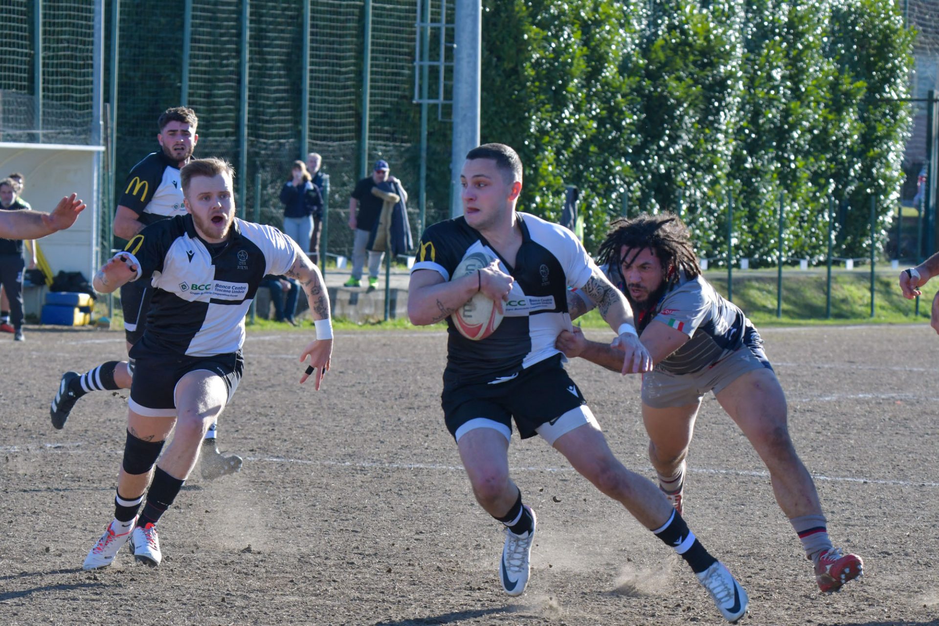 Gli ospiti si sono affacciati per la prima volta in attacco al 31° arrivando però fino in meta e sopravanzando i bianconeri per 3-7; gli ultimi minuti della prima frazione di gioco hanno però riservato bellissimi sprazzi di gioco bianconeri e, grazie ad una nuova punizione e ad una meta di Bartolomucci, hanno portato le squadre al riposo sul punteggio di 11-7 in favore del Banca Centro CUS Siena.