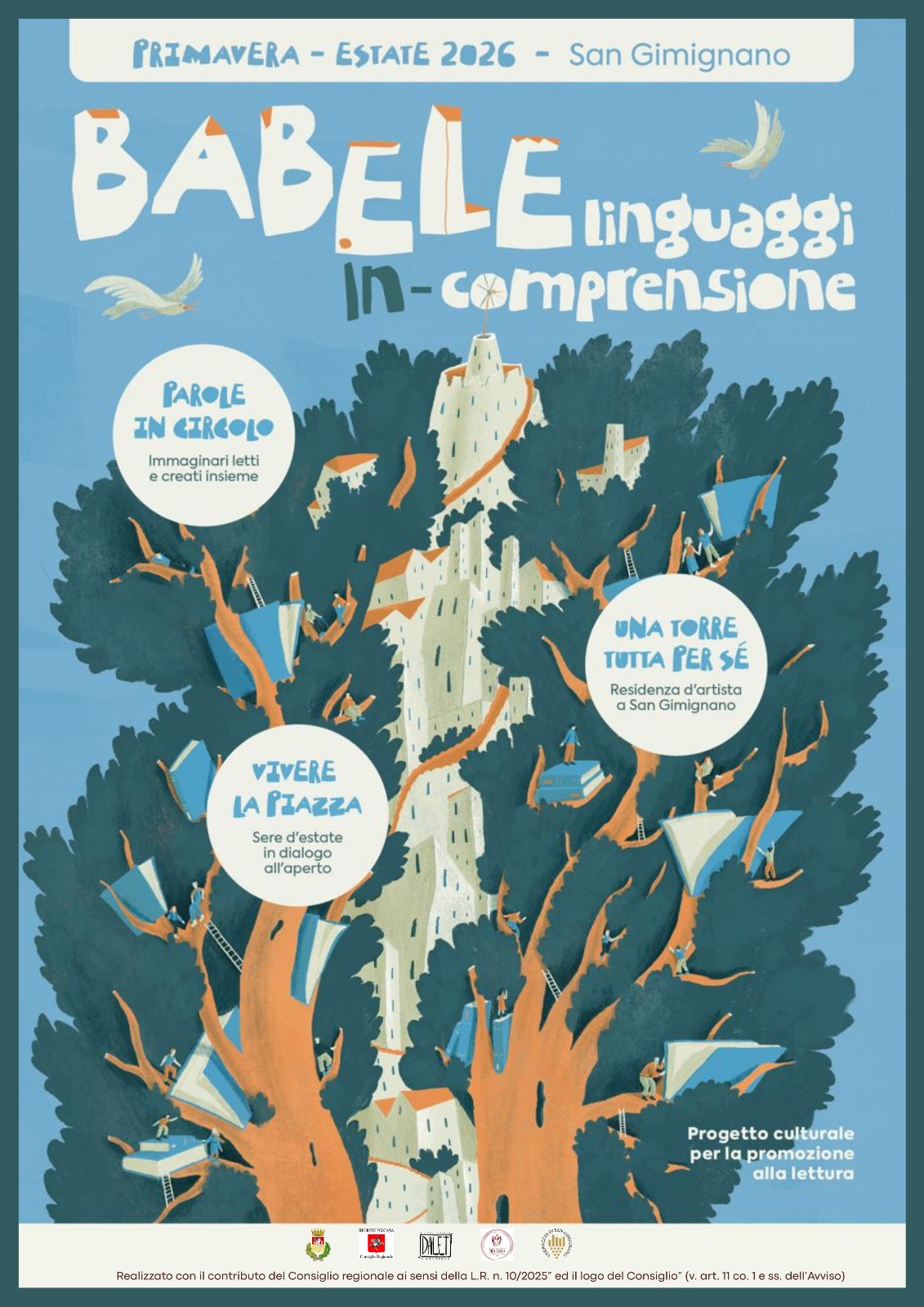 Le letture corali nella RSA Santa Fina fanno parte di “Parole in circolo”, primo di tre filoni di sviluppo del progetto che comprende anche laboratori di lettura e scrittura creativa per bambini e ragazzi, reading urbani itineranti e scambio libero di libri. Il secondo filone si intitola “Una torre tutta per sé” e prevede una residenza artistica che dal 20 al 24 aprile porterà a San Gimignano tre autori o autrici selezionati tramite una call pubblica e pronti a relazionarsi con la città e la comunità per poi restituire la loro esperienza con una “Lettera alla città” e un evento pubblico. A chiudere il progetto “Babele. Linguaggi In-comprensione” saranno tre serate estive previste nel mese di luglio con “Vivere la Piazza”, in compagnia di scrittori, poeti, saggisti e artisti della parola di rilievo nazionale.