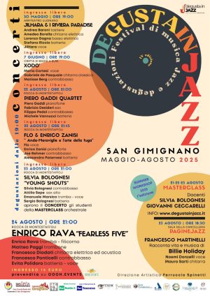 Musica di qualità, luoghi unici e un’atmosfera irripetibile: Degusta in Jazz torna ad animare San Gimignano dal 22 al 24 agosto con tre giorni di concerti, incontri e degustazioni che intrecciano note e sapori, valorizzando le eccellenze del territorio, come la Vernaccia, la bellezza del centro storico e promuovendo messaggi di sostenibilità e partecipazione. Il Festival, con la direzione artistica di Ferruccio Spinetti, è organizzato dall’Associazione Degusta in Jazz Eventi e dall’Associazione Albergatori San Gimignano con il patrocinio del Comune di San Gimignano. L’evento porterà sul palco della Rocca di Montestaffoli grandi nomi del panorama jazzistico italiano e internazionale, accanto a giovani talenti emergenti.