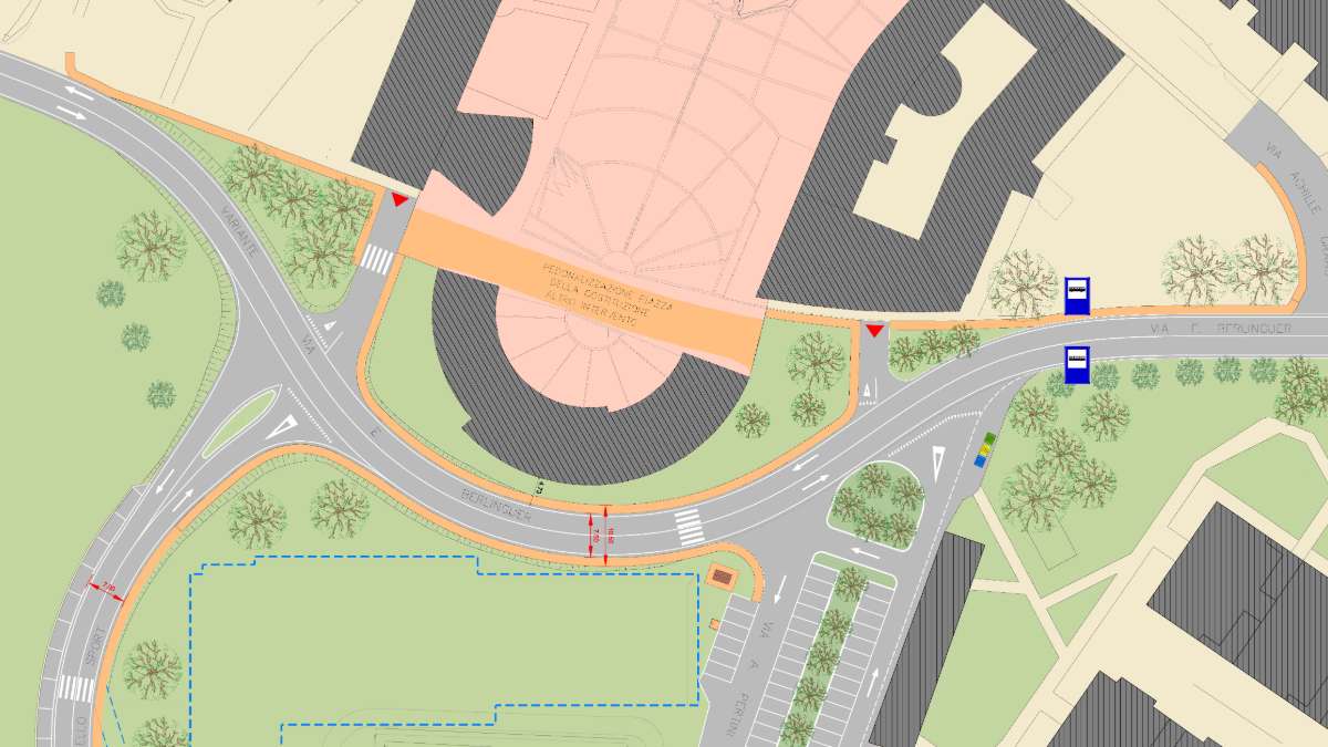 Nello specifico la decisione presa ha appunto l’obiettivo di eliminare il traffico veicolare nella porzione compresa tra piazza della Costituzione e l’edificio denominato Emiciclo, e per farlo si prevede che circa 150 metri di via Berlinguer siano destinati solo a uso pedonale con ovvi benefici per la sicurezza e la fruibilità delle attività, di cui la maggior parte pubbliche, presenti nell’area. Il nuovo tracciato in variante è previsto nell’area compresa tra l’Emiciclo e il campino di calcio, andando a occupare una piccola parte dell’area di parcheggio che si trova in via Alessandro Pertini. Nel progetto vengono ridisegnate quindi le intersezioni con la suddetta Via Pertini e con Via Veterani dello Sport, garantendo un più adeguato accesso agli impianti sportivi. Inoltre questa deflessione del tracciato determinerà il rallentamento dei veicoli in transito e una diminuzione della pendenza del tratto finale della discesa, avendone allungato il percorso. Le zone residuali verranno sistemate a verde con la piantumazione di alberi e arbusti.