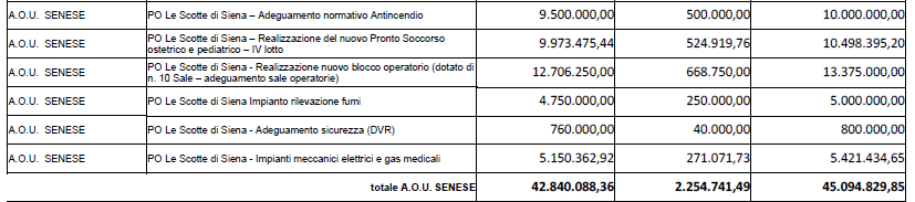 Alle aziende e agli enti del Servizio sanitario regionale sono stati assegnati quasi 300 milioni di euro per interventi strutturali da avviare negli anni 2020-2021. E’ quanto è stato definito nell’ultima seduta di Giunta su proposta dell’assessore al diritto alla salute, Stefania Saccardi, tramite l’approvazione di due specifiche delibere. Le risorse stanziate ammontano per l’esattezza a 298.836.912,50 euro, di cui quasi 30 milioni di euro (29.346.854,83 €) provengono da fondi regionali immediatamente disponibili, mentre i rimanenti 269.490.057,67 euro da fondi statali, che potranno essere utilizzati a inizio 2021, una volta sottoscritto il relativo accordo di programma con il Ministero della Salute, di cui costituisce il presupposto l’atto con il quale la Regione individua gli investimenti da finanziare. Le aziende e gli enti del Servizio sanitario regionale, beneficiari di queste risorse, possono dunque completare le progettazioni degli interventi da finanziare con i contributi assegnati dalla Regione, già a partire dal corrente anno. Sono 45 i milioni per la sanità senese: tra gli interventi finanziati, il nuovo pronto soccorso pediatrico ed ostetrico delle Scotte e il blocco con le nuove 10 sale operatorie.
