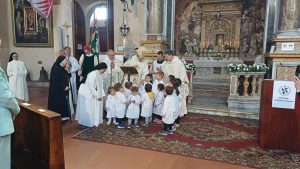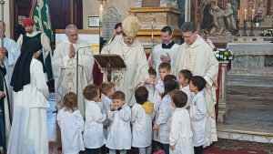 La messa si è conclusa con un simpatico sipario del cardinale Lojudice che ha chiamato a sè i bambini presenti in chiesa che gli hanno regalato delle colombe bianche di carta e tutti insieme hanno invocato la pace, recitando l’Ave Maria.