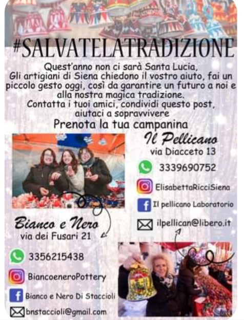 L’emergenza Covid in atto ha costretto l’annullamento della tradizionale fiera di Santa Lucia del 13 dicembre, appuntamento immancabile e “sacro” del calendario senese. Gli artigiani senesi di due laboratori della città, che producono le campanine di Santa Lucia, chiedono così alla città un aiuto, e di prenotare comunque i caratteristici prodotti di ceramica: “Salvate la tradizione – si legge in un depliant diffuso – quest’anno non ci sarà santa Lucia, fai un piccolo gesto così da garantire il futuro a noi e alla nostra magica tradizione”.