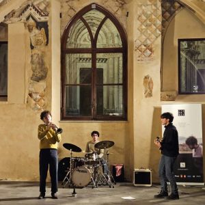 A dare continuità al percorso, piano dopo piano, ci ha pensato la musica dal vivo: gli studenti di Siena Jazz – Accademia Nazionale del Jazz, disposti come piccole “stazioni sonore”, capaci di cambiare tono agli ambienti senza coprirli. Non un sottofondo indistinto, ma interventi puntuali: un tema che accompagna la salita, un dialogo tra strumenti che invita a fermarsi, un ritmo che fa sembrare più breve un corridoio. La degustazione dei vini di Castello di Albola (Radda in Chianti) ha completato il quadro con una presenza discreta: calici ben scelti, sorseggiati mentre lo sguardo si spostava dalle volte alle teche, dai frammenti archeologici alle grandi campiture pittoriche.