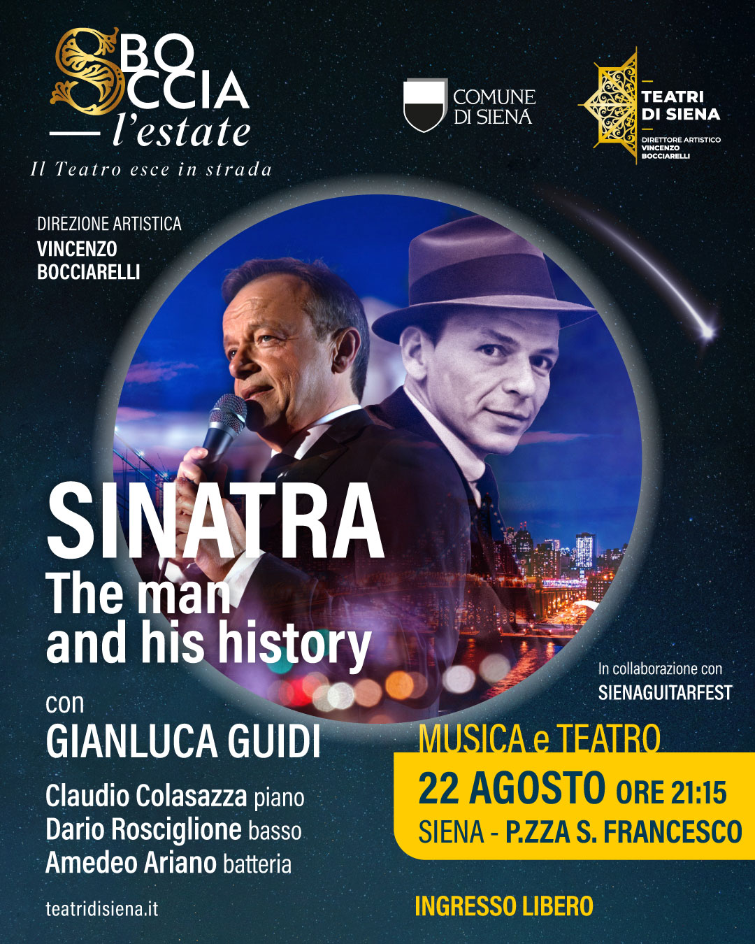 Si parte giovedì 21 agosto alle ore 19.30 alle Fonti di Pescaia con Sunset & Songs, concerto-aperitivo che vedrà protagonista Sergio Corbini in un’atmosfera suggestiva alla luce del tramonto. Da venerdì 22 a domenica 24 agosto gli eventi si spostano invece in Piazza San Francesco: venerdì 22 alle ore 21.15 sarà la volta di Sinatra – The man and his history, con Gianluca Guidi che renderà omaggio a una delle voci più celebri e amate del Novecento in una serata che fonde musica e teatro.
