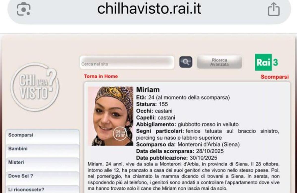 Cresce la preoccupazione per la scomparsa di Miriam Oliviero, 24 anni, residente a Monteroni d’Arbia, nel Senese. La giovane è ufficialmente segnalata anche sul portale del programma Chi l’ha visto di Rai 3, che ha diffuso un aggiornamento con nuovi dettagli sulla giornata della scomparsa.